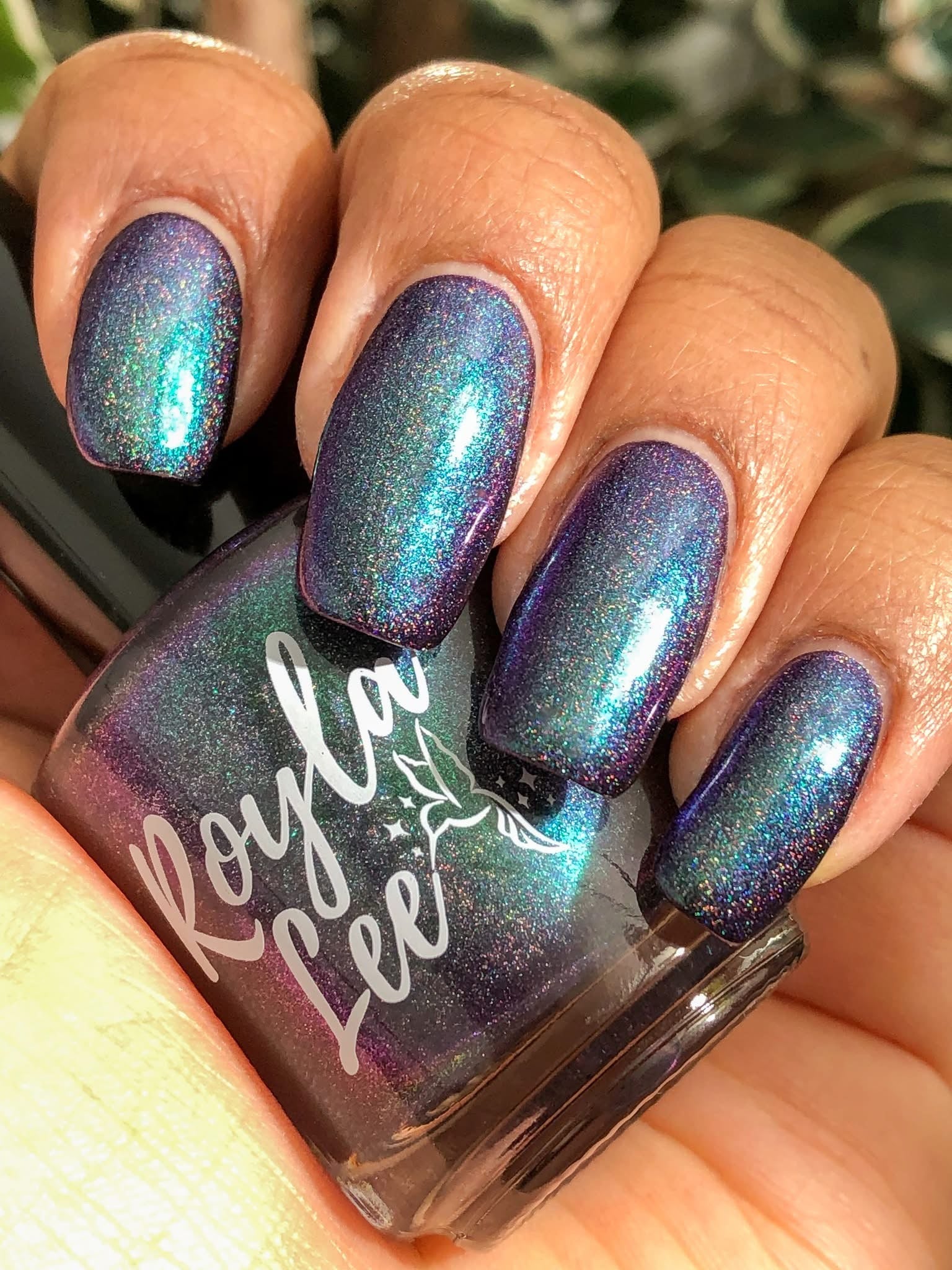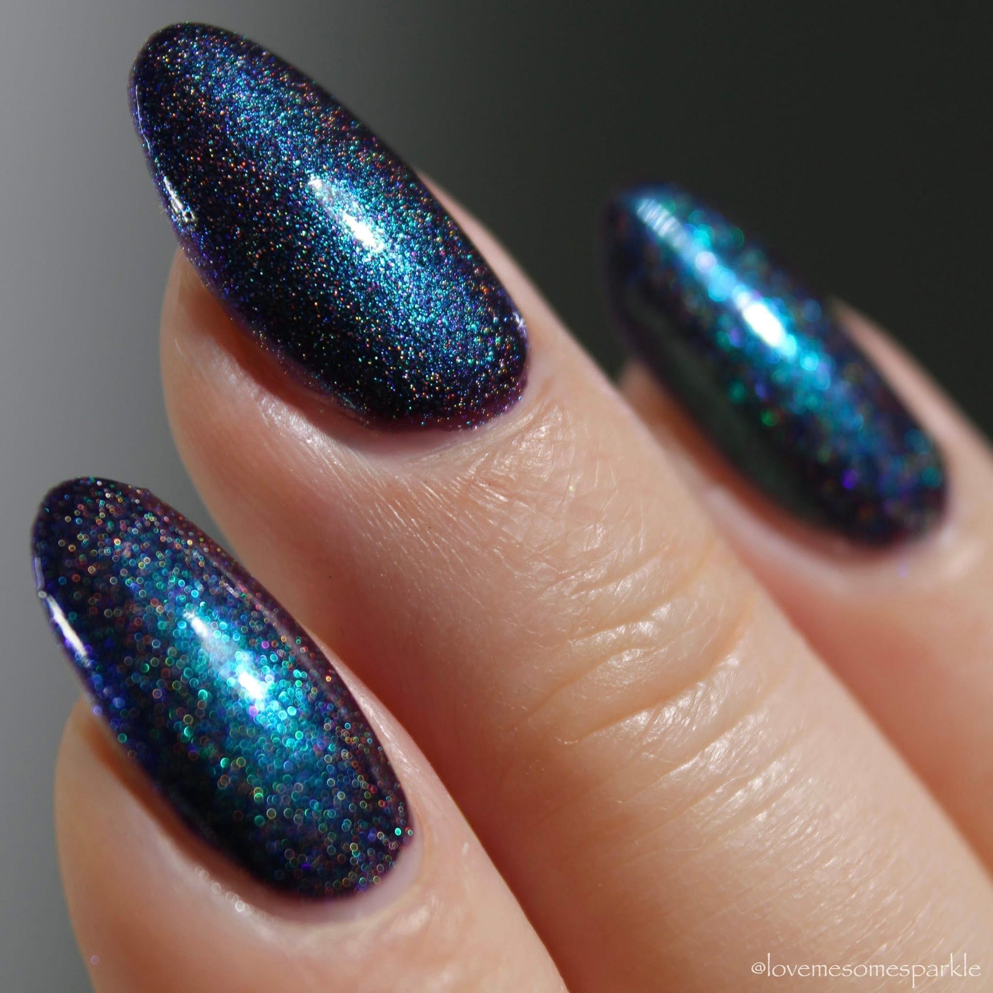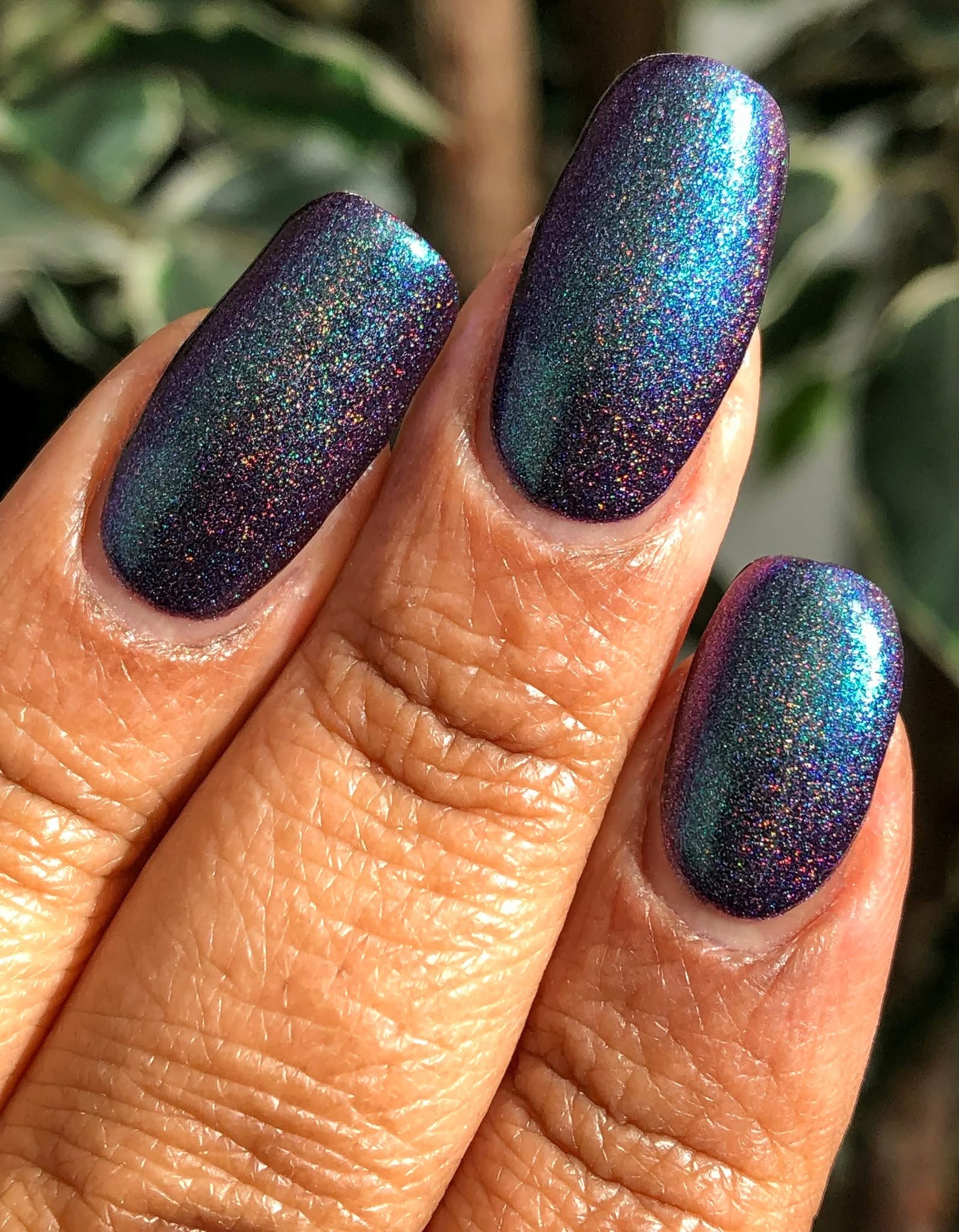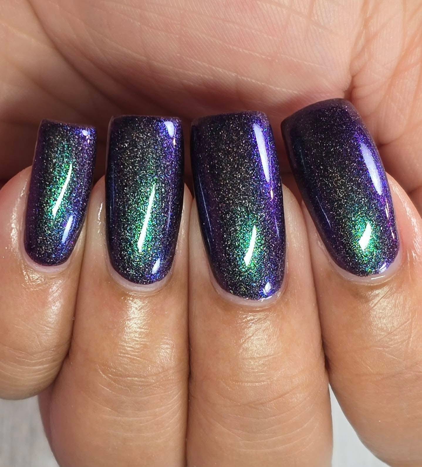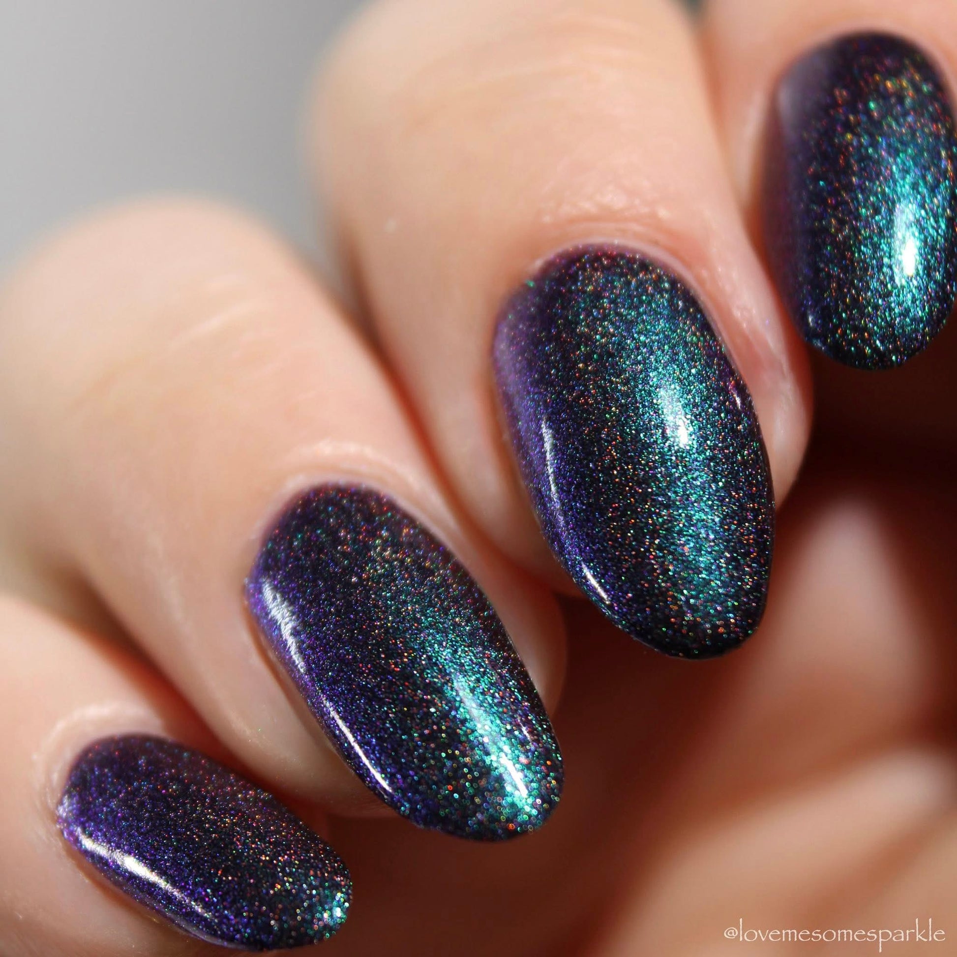 A blackened purple base with teal to blue shifting shimmer and scattered holo.