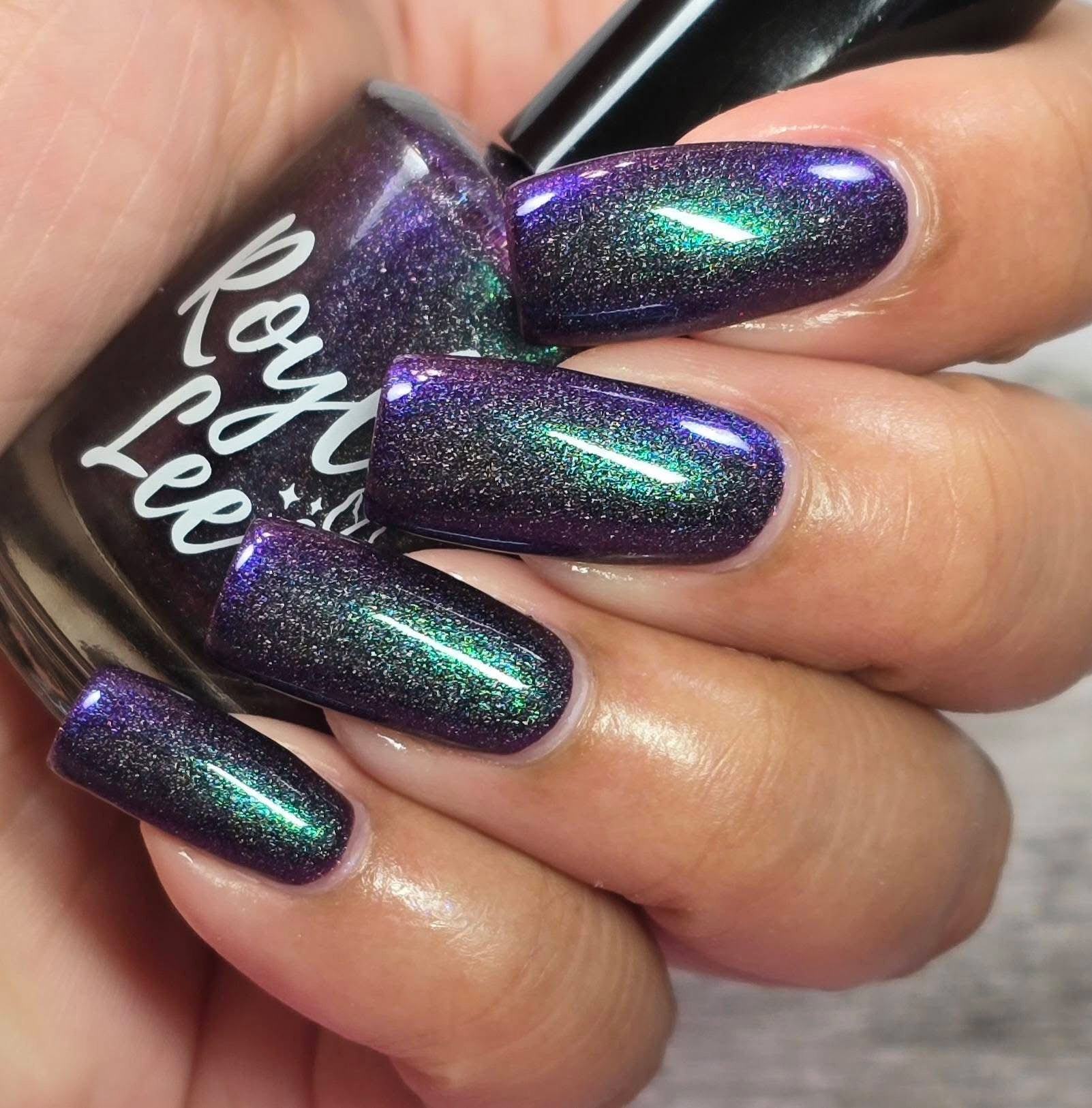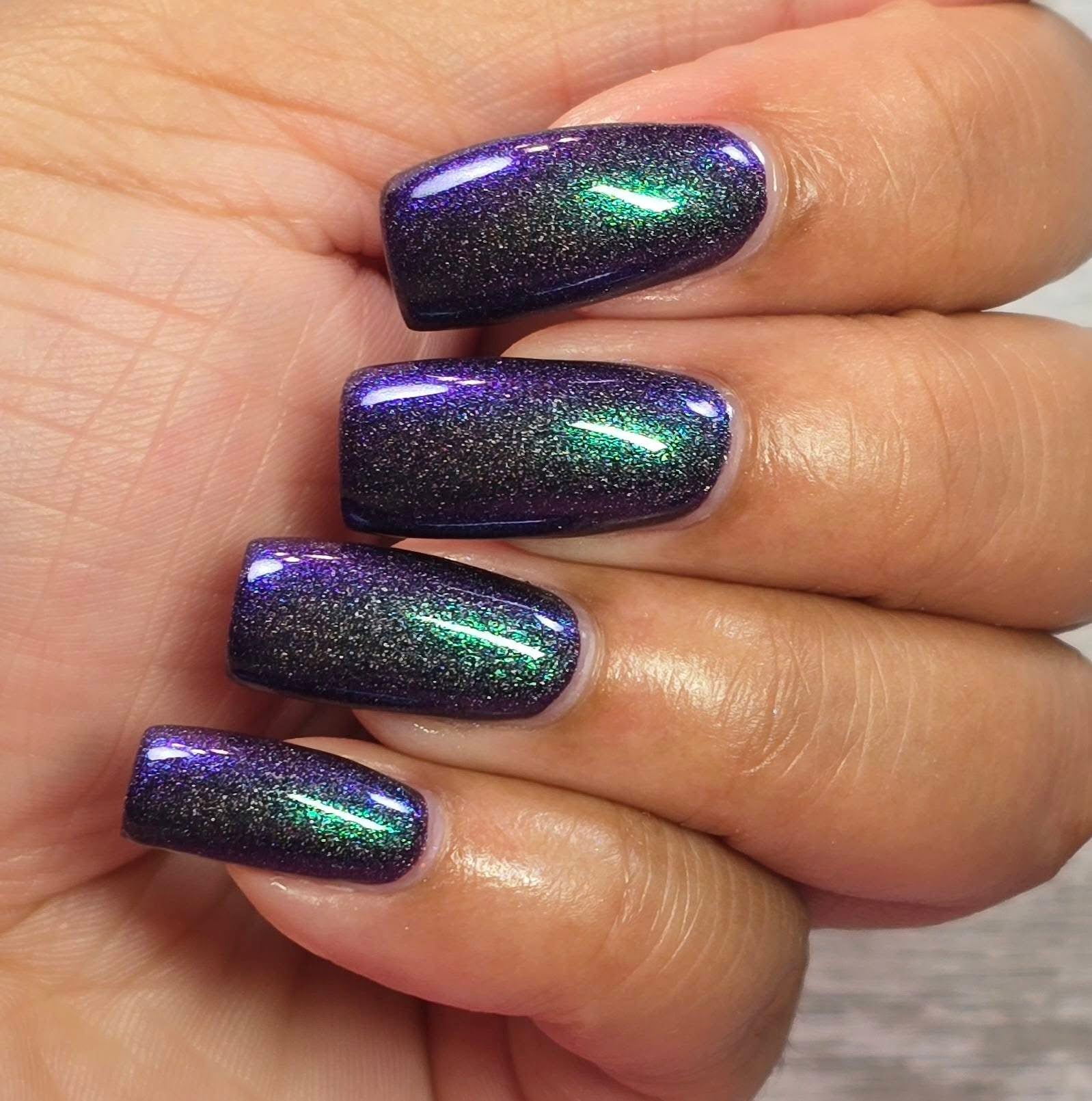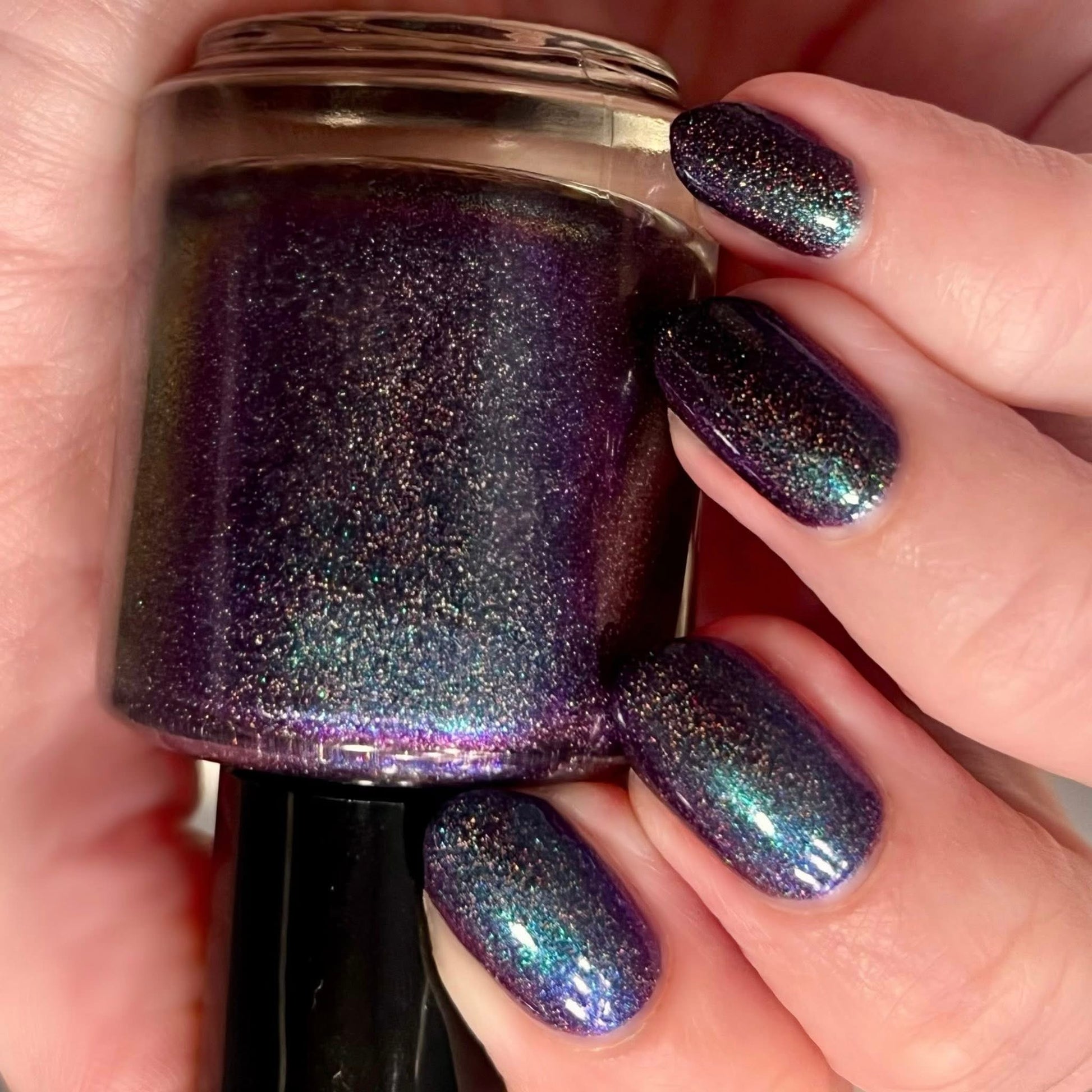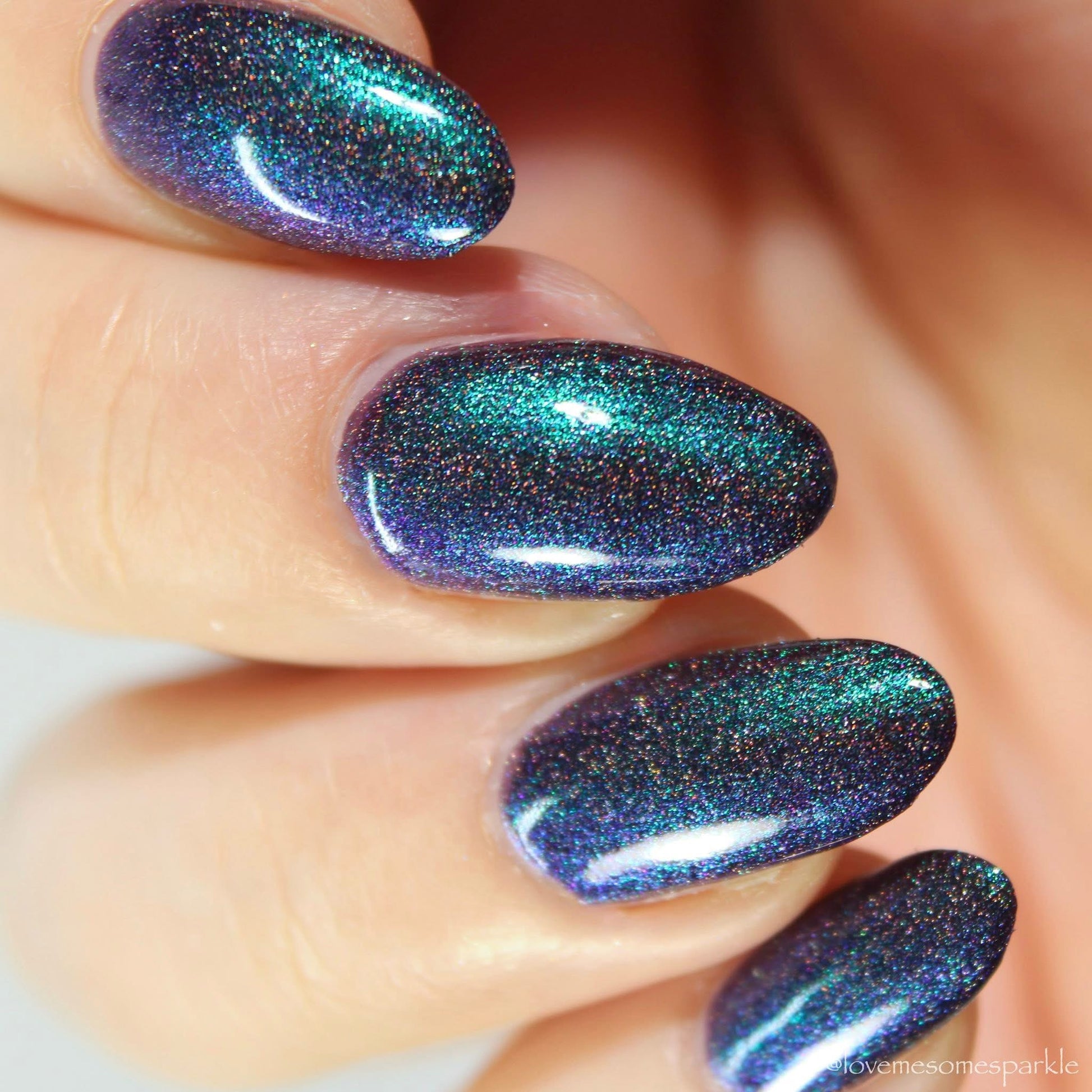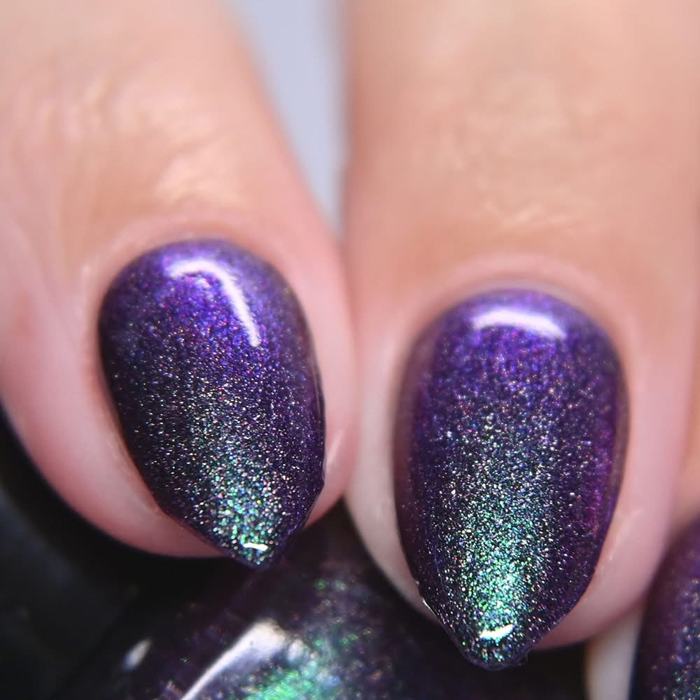 A blackened purple base with teal to blue shifting shimmer and scattered holo.