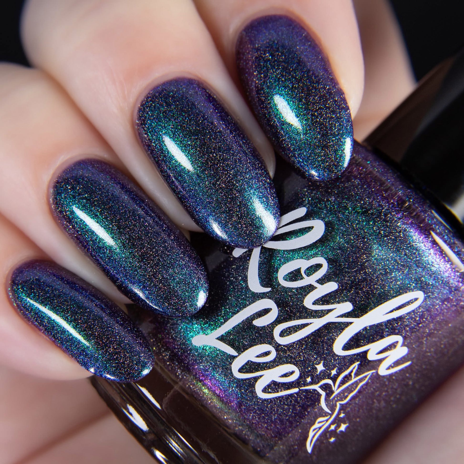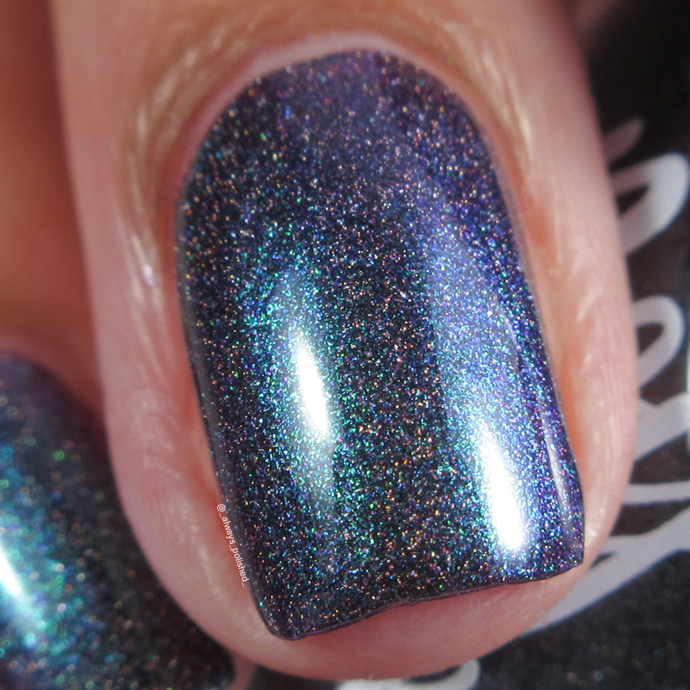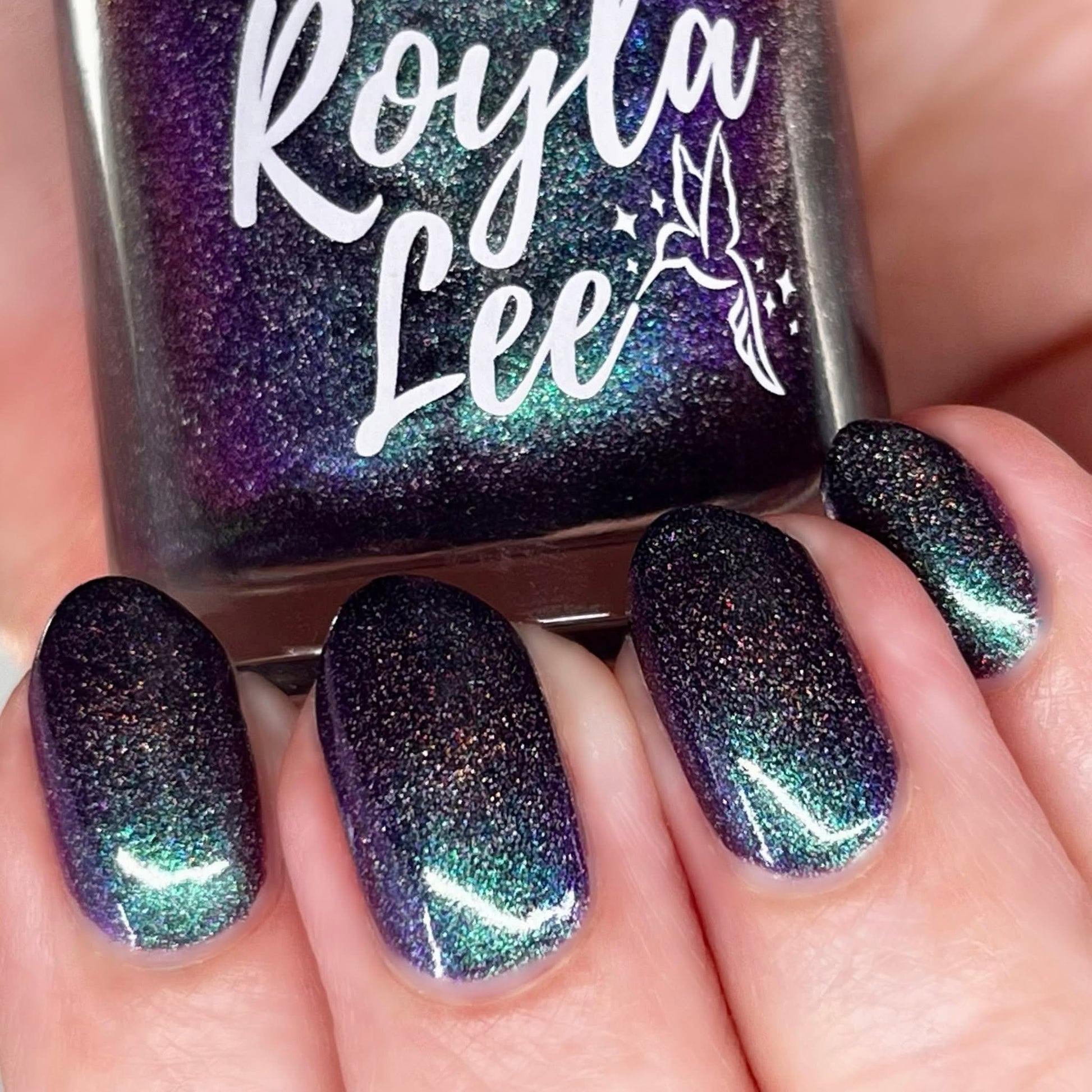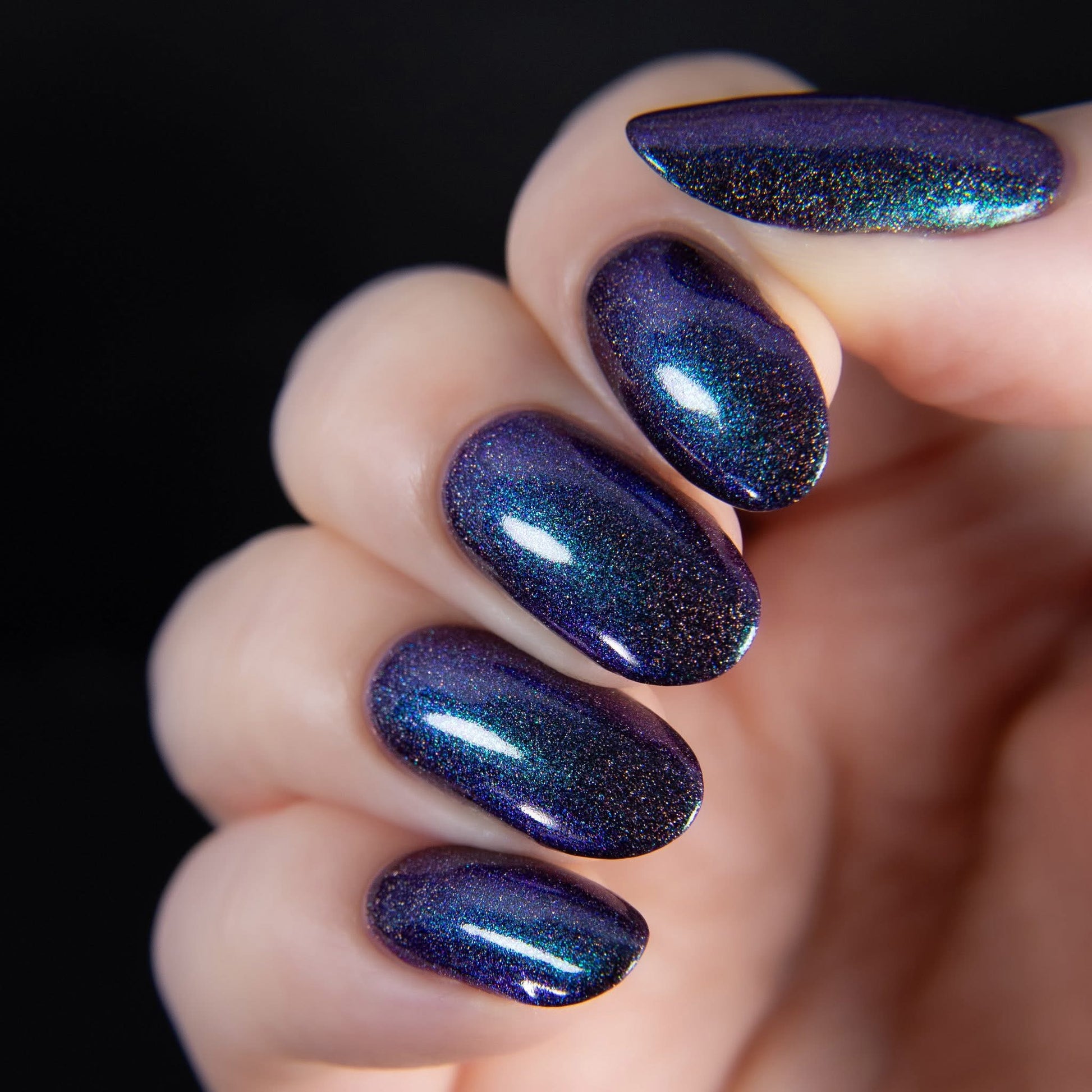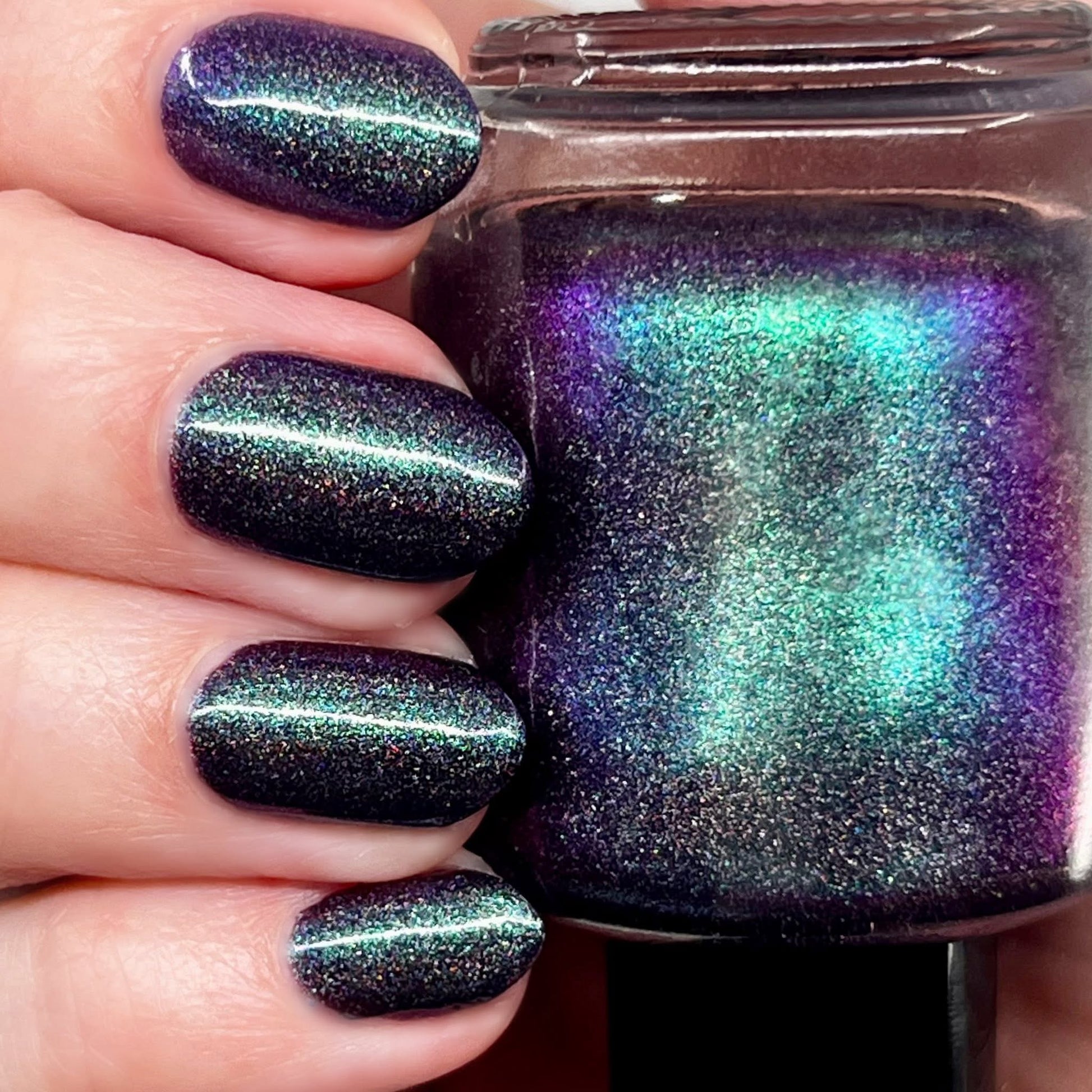 A blackened purple base with teal to blue shifting shimmer and scattered holo.