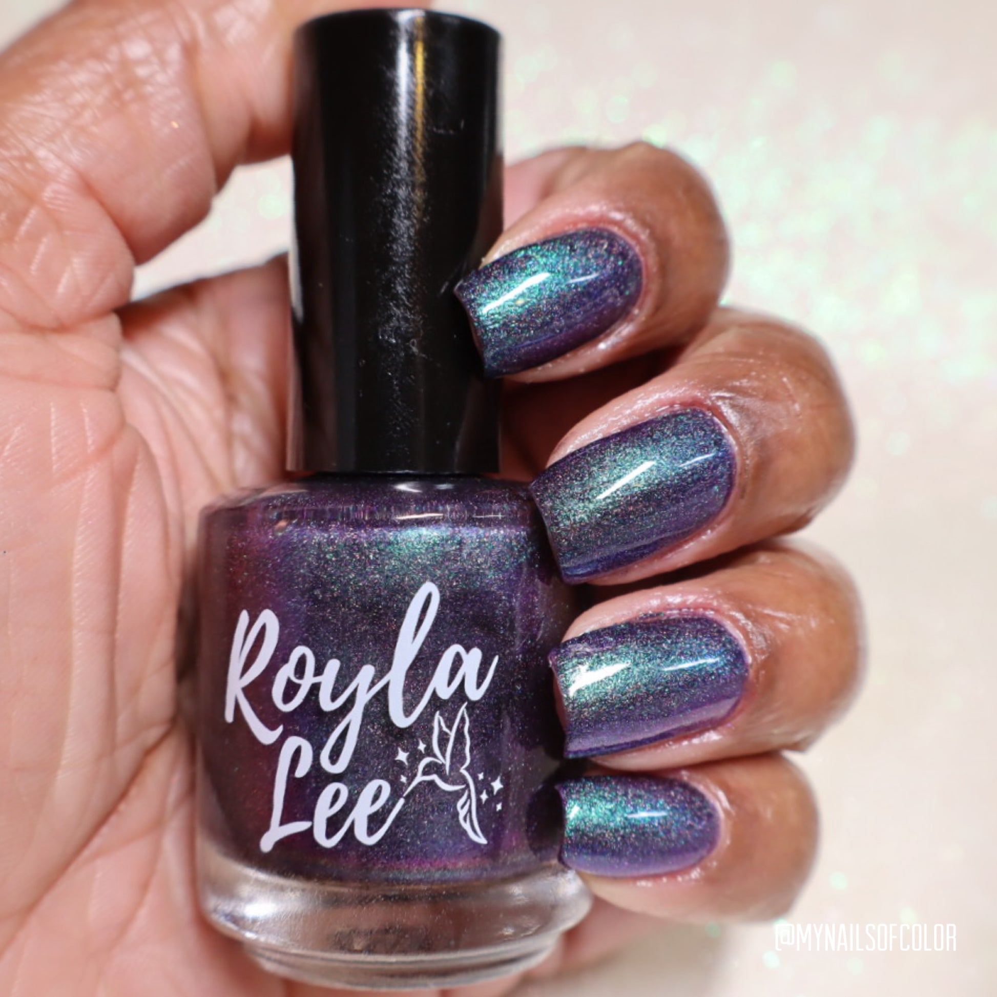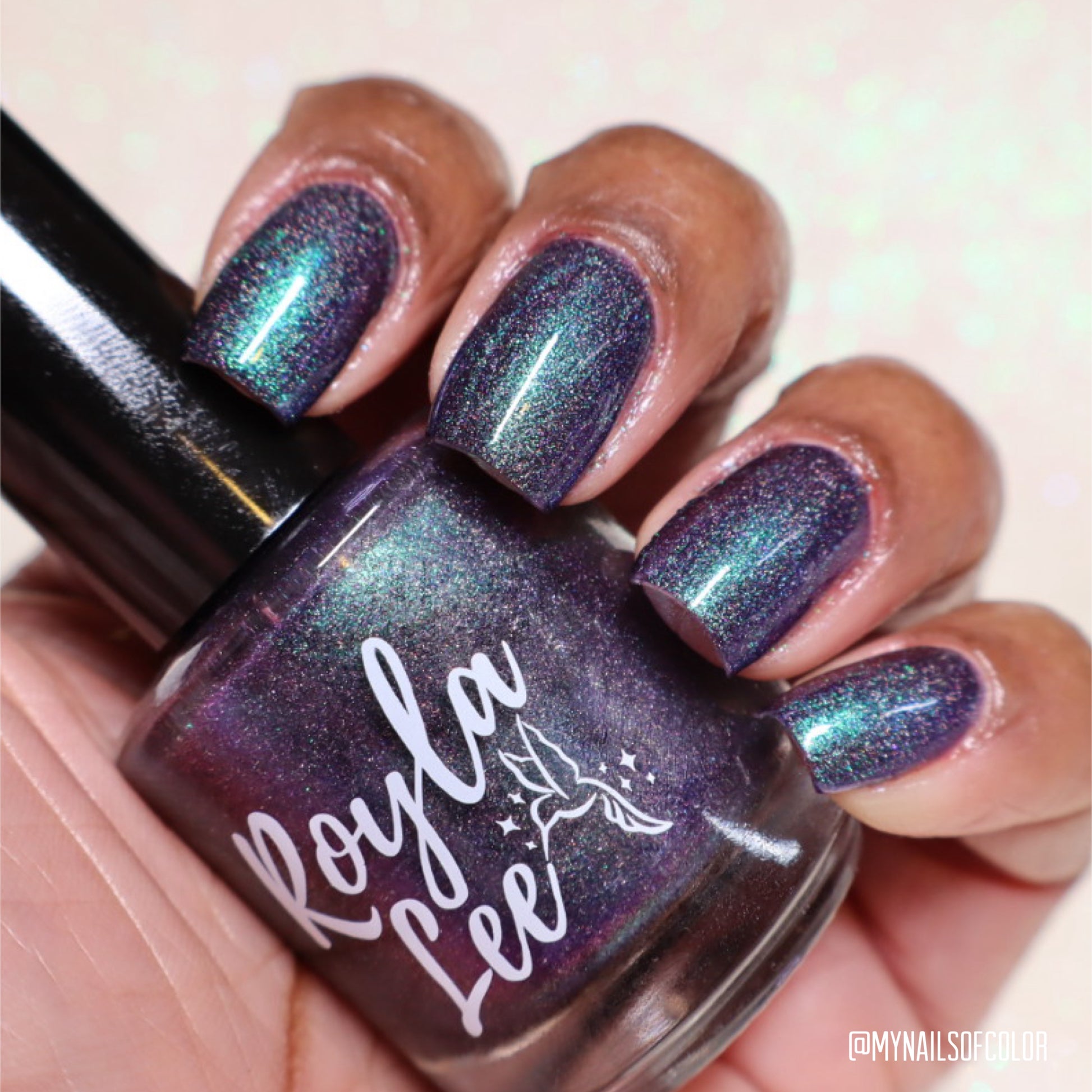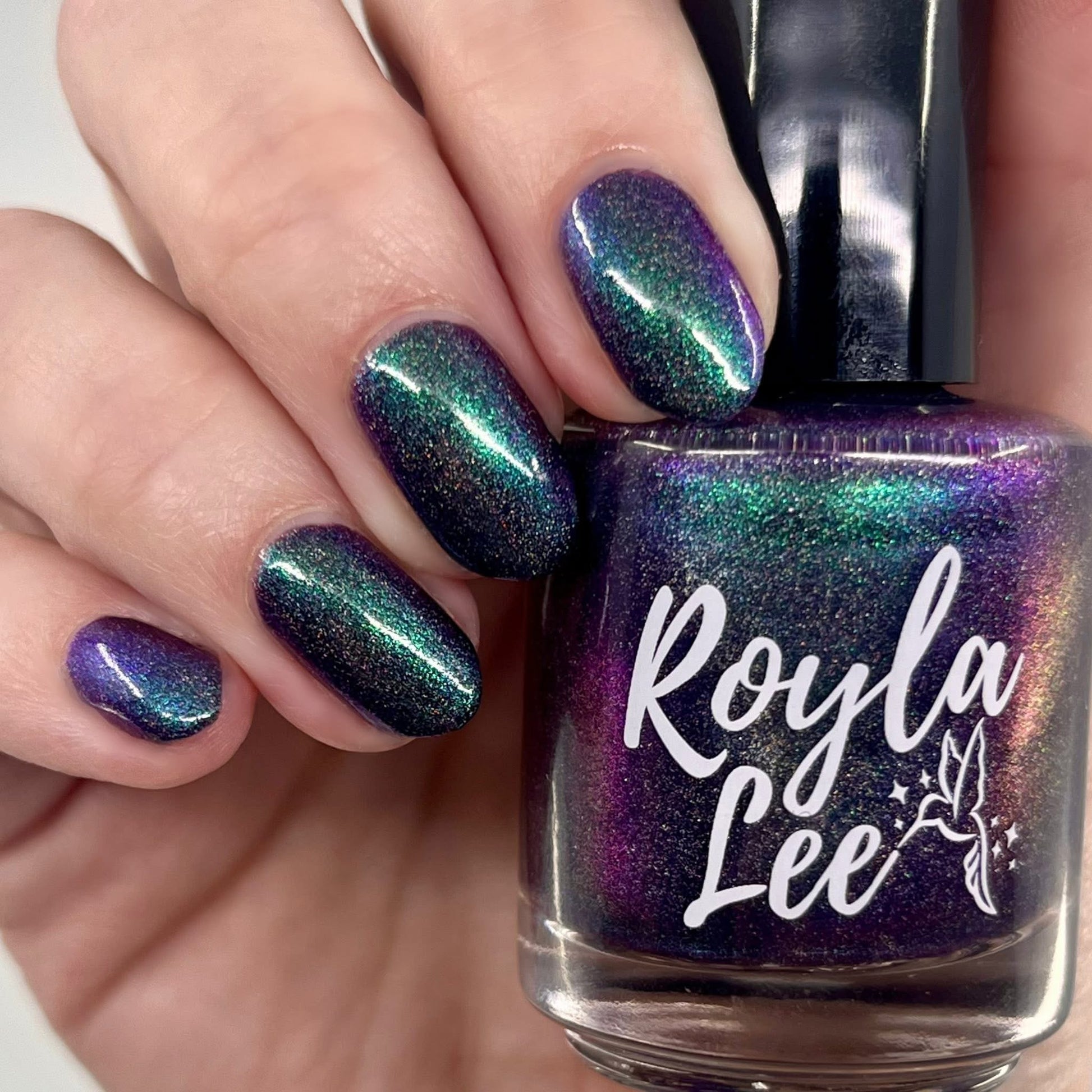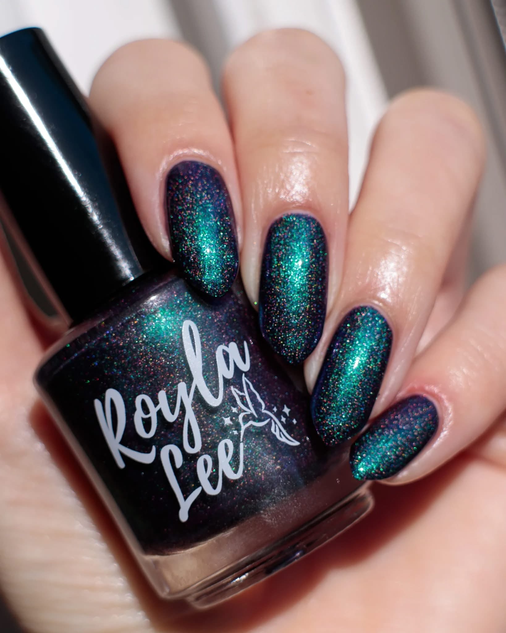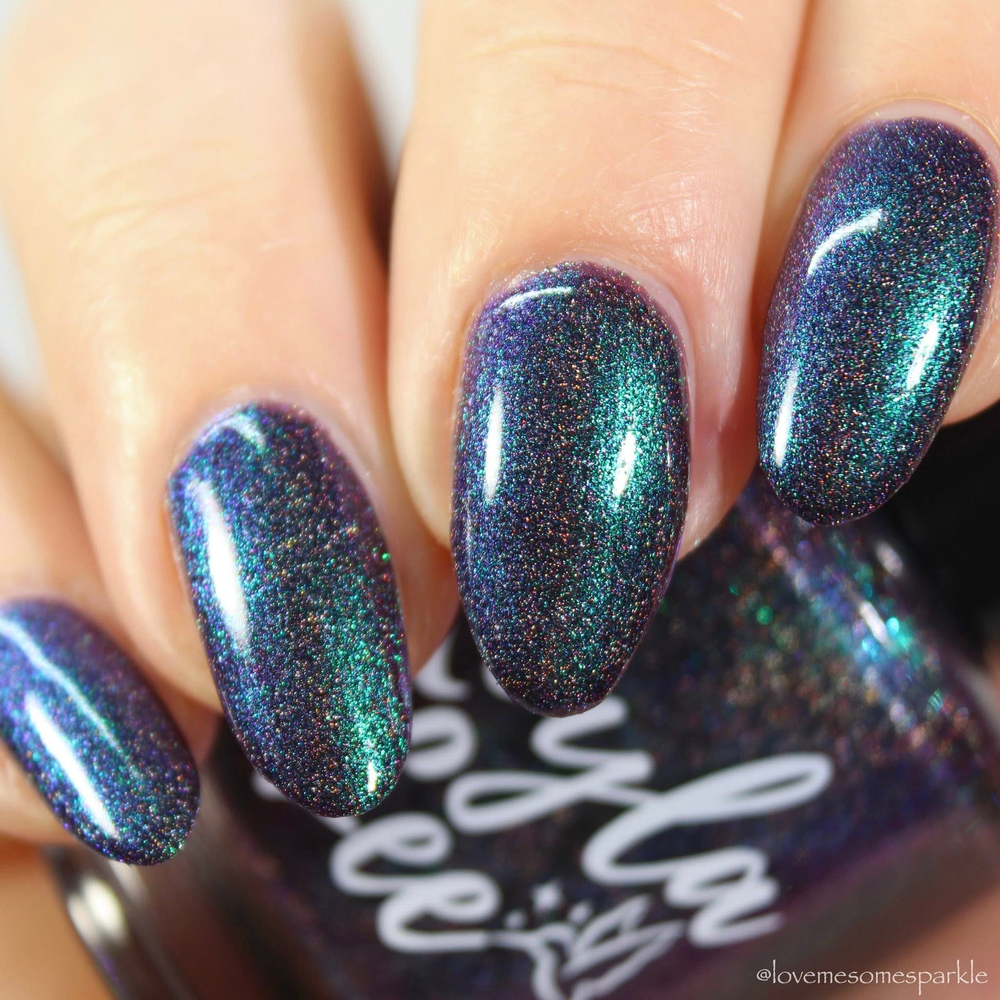 A blackened purple base with teal to blue shifting shimmer and scattered holo.