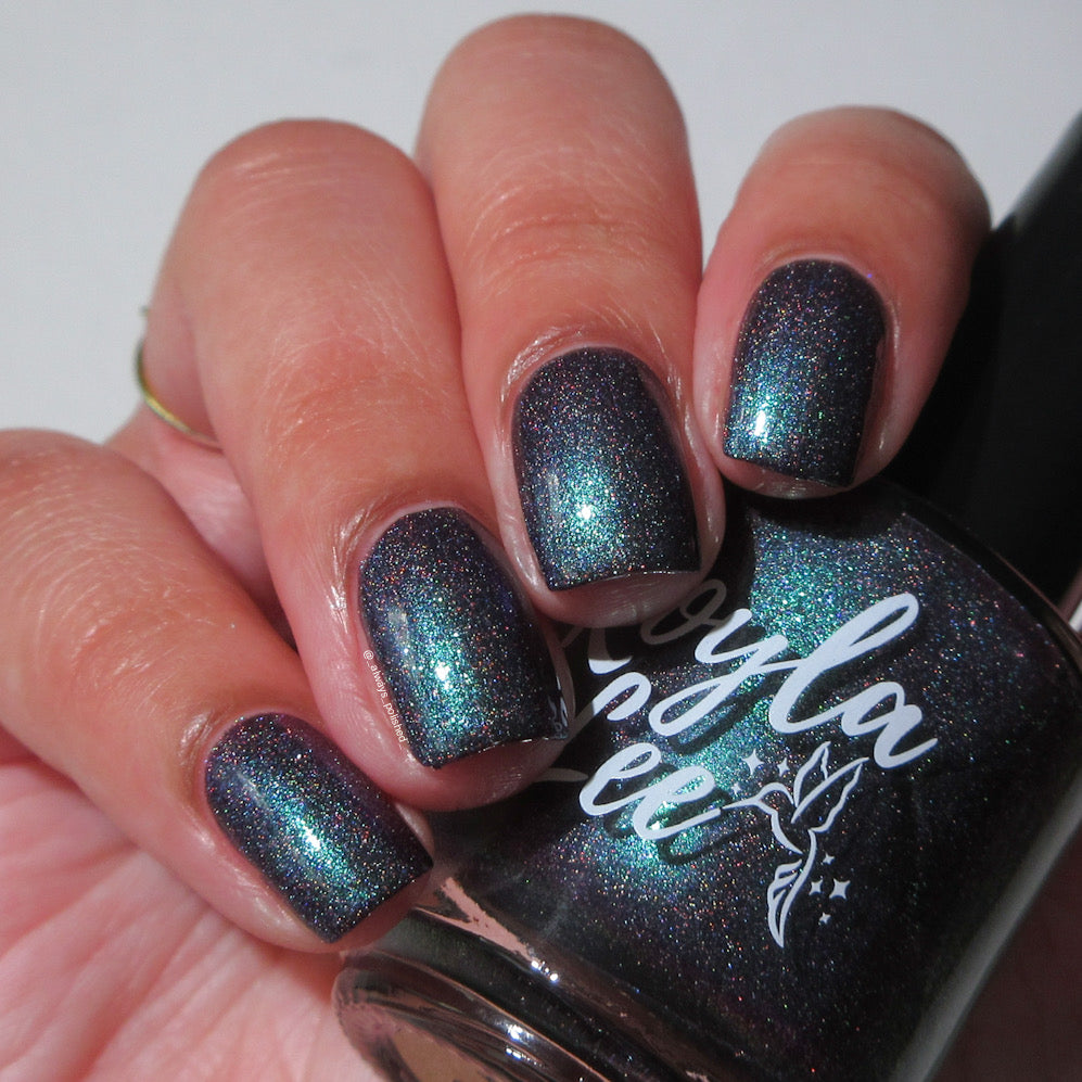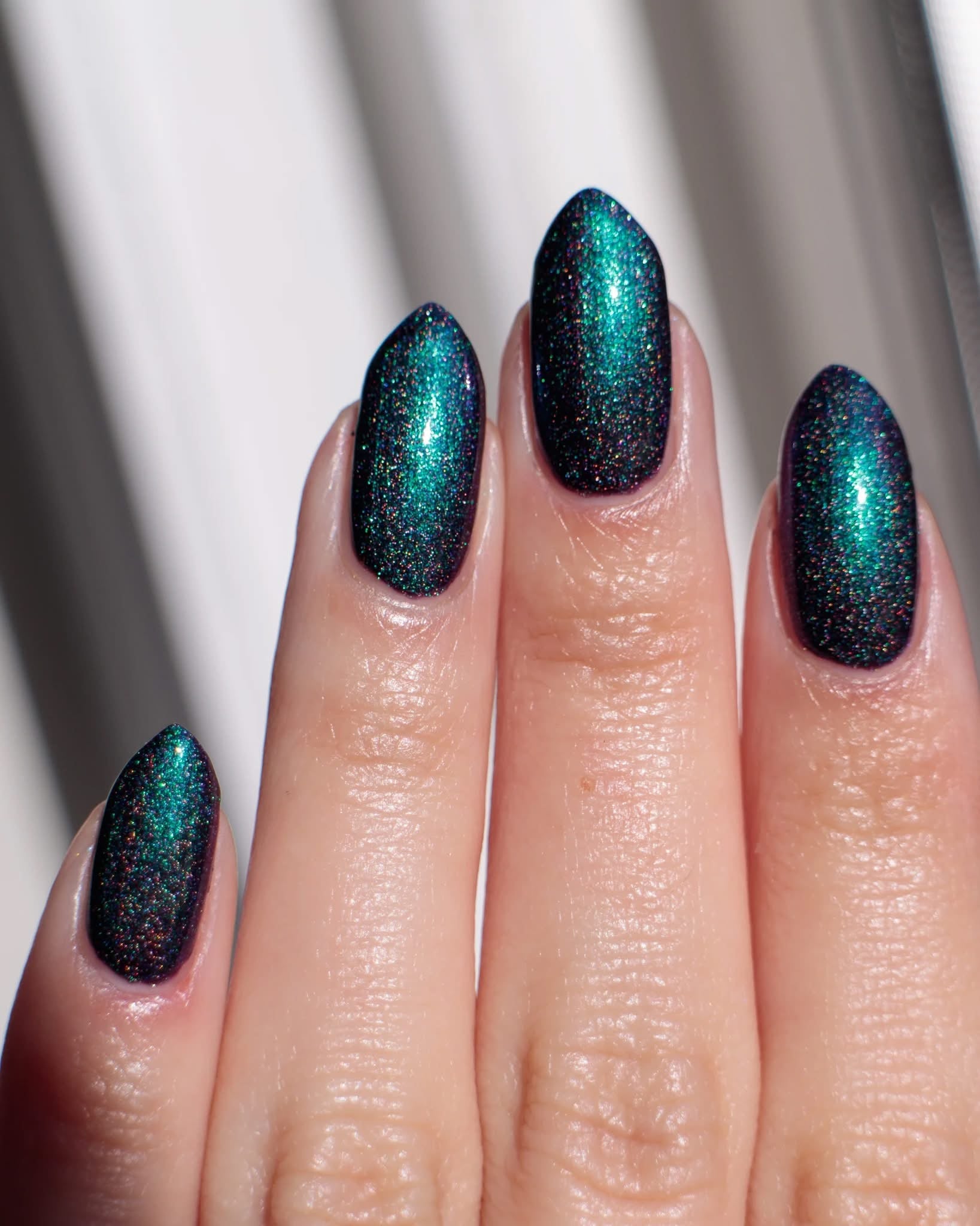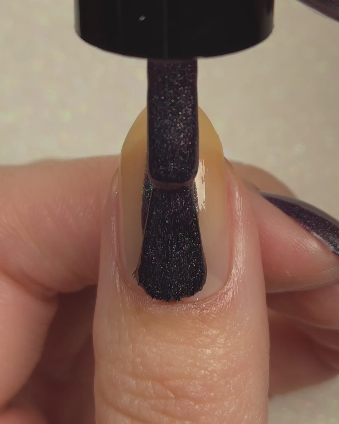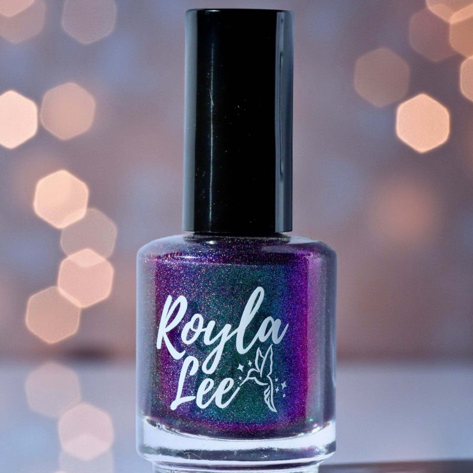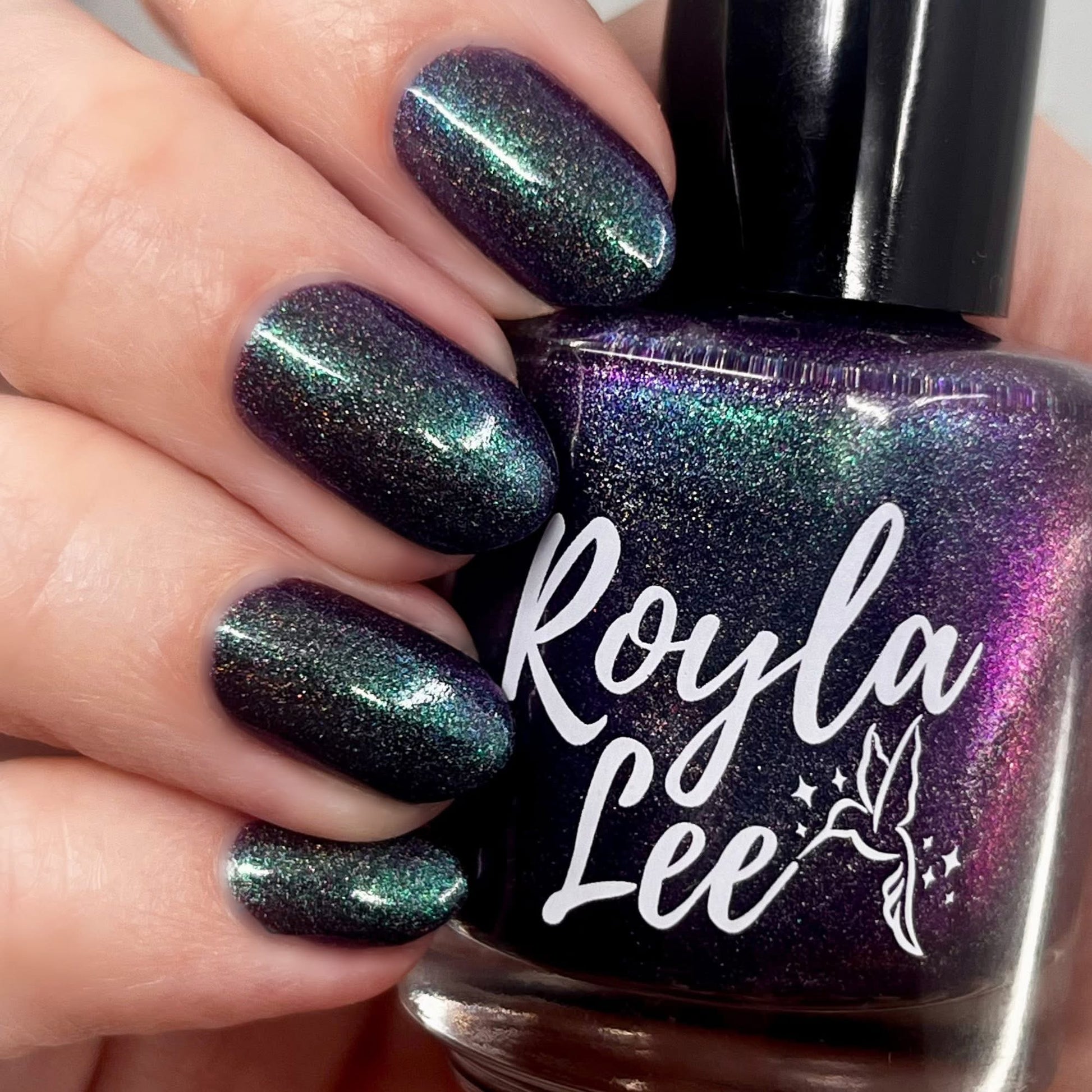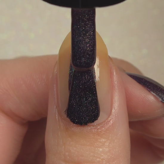 A blackened purple base with teal to blue shifting shimmer and scattered holo.