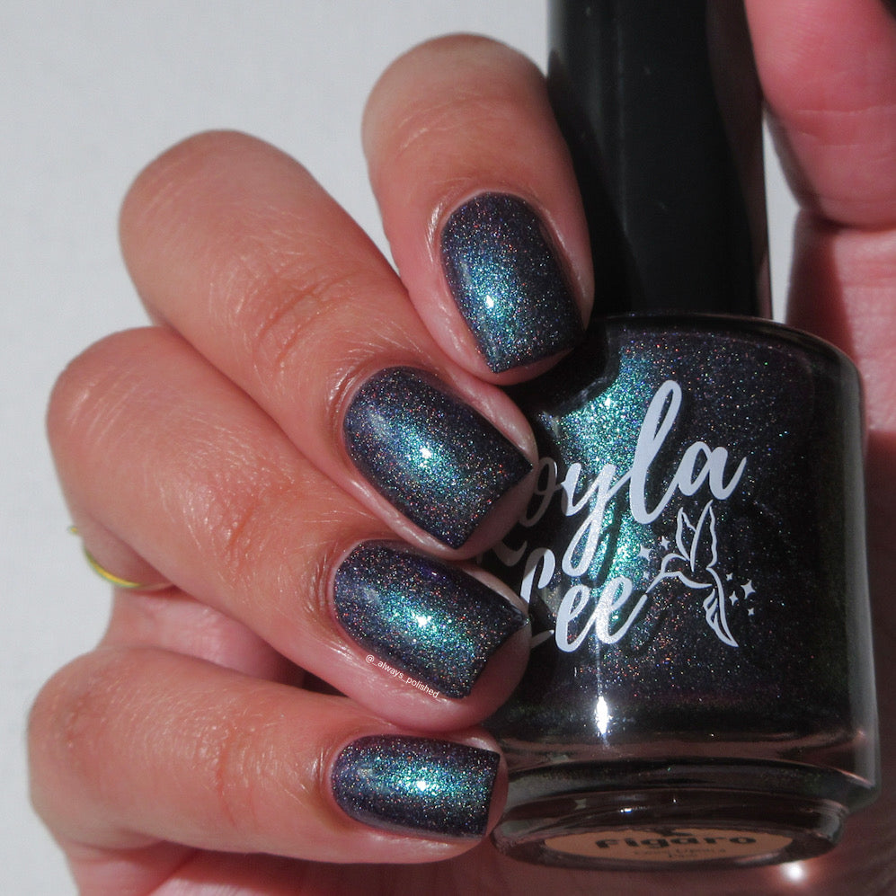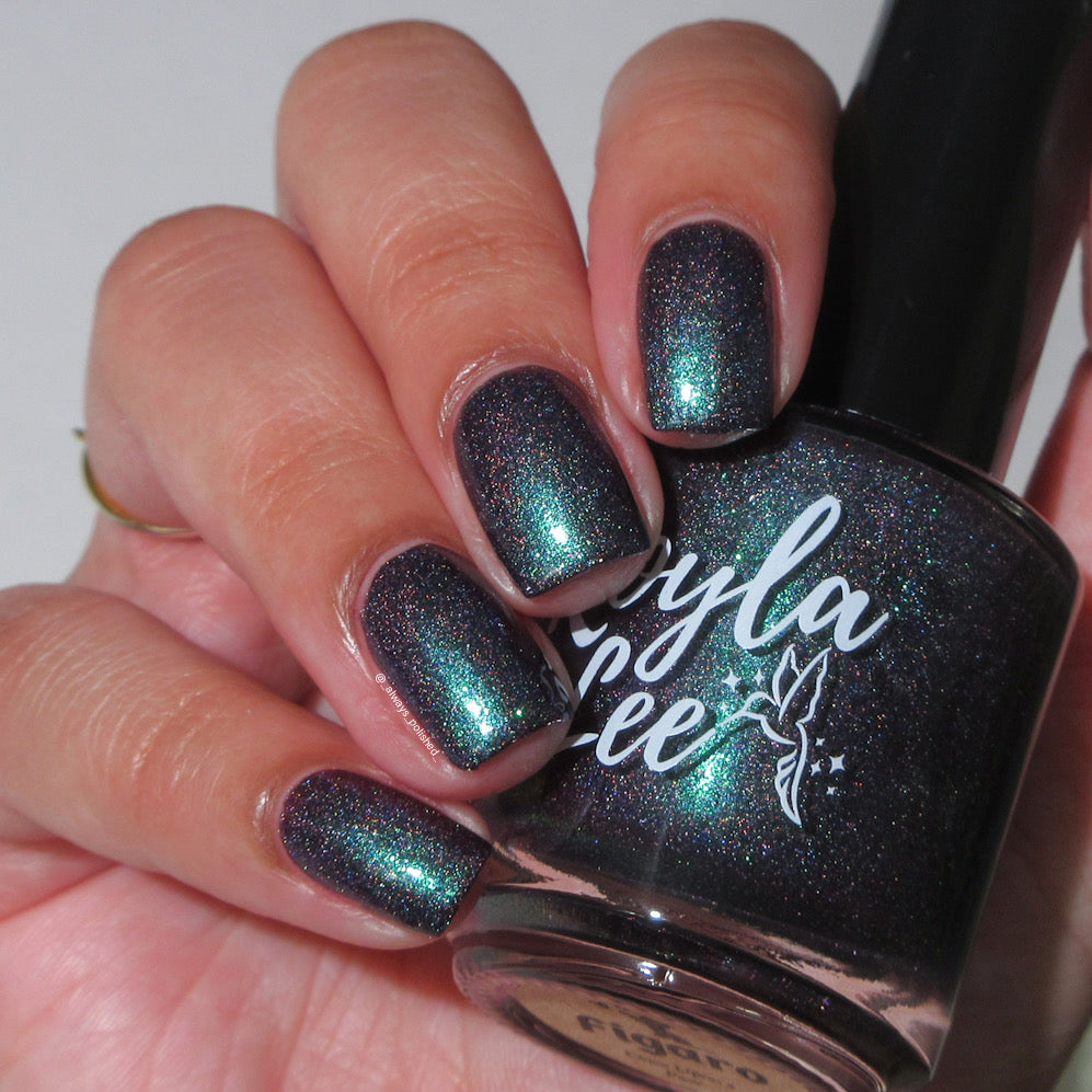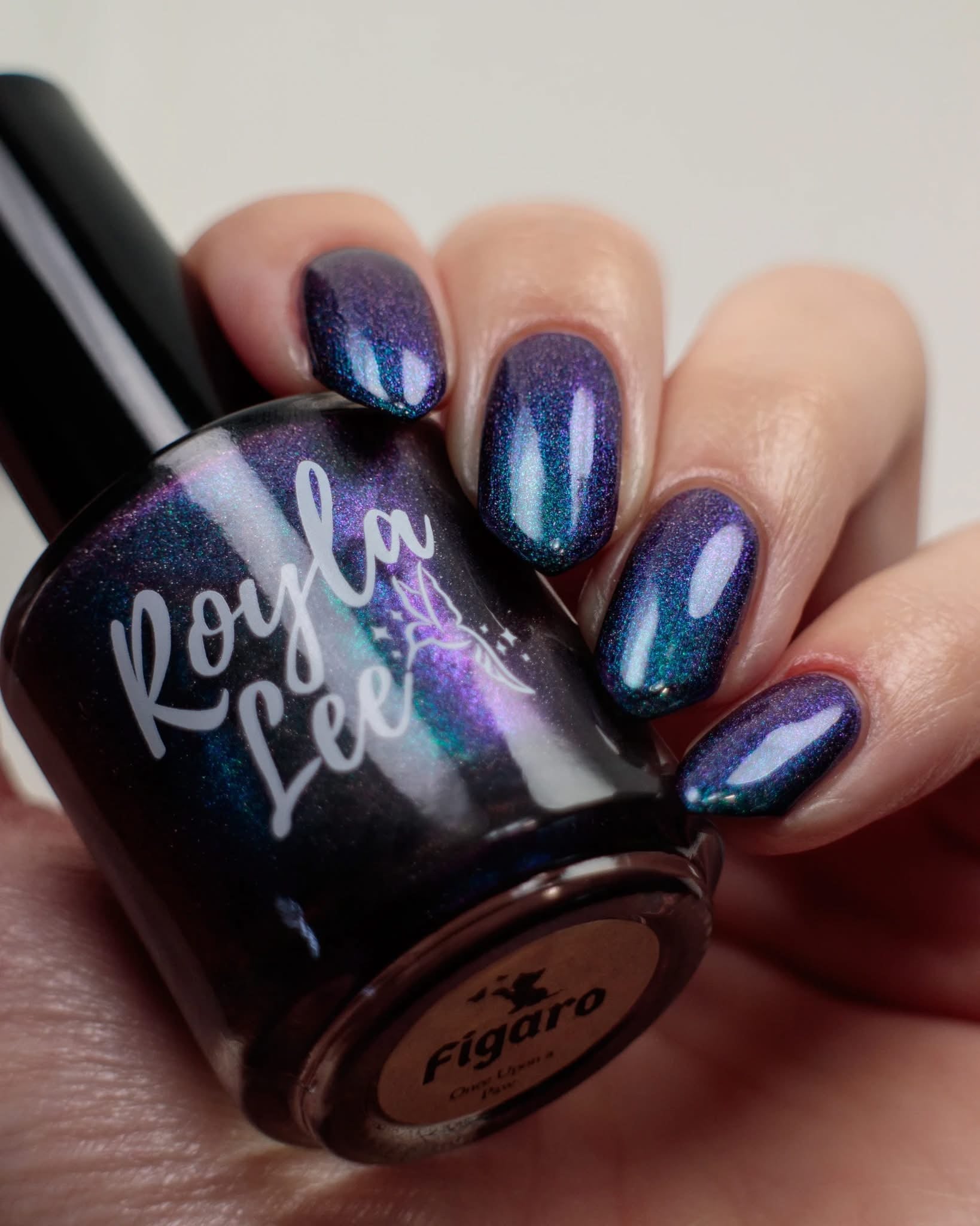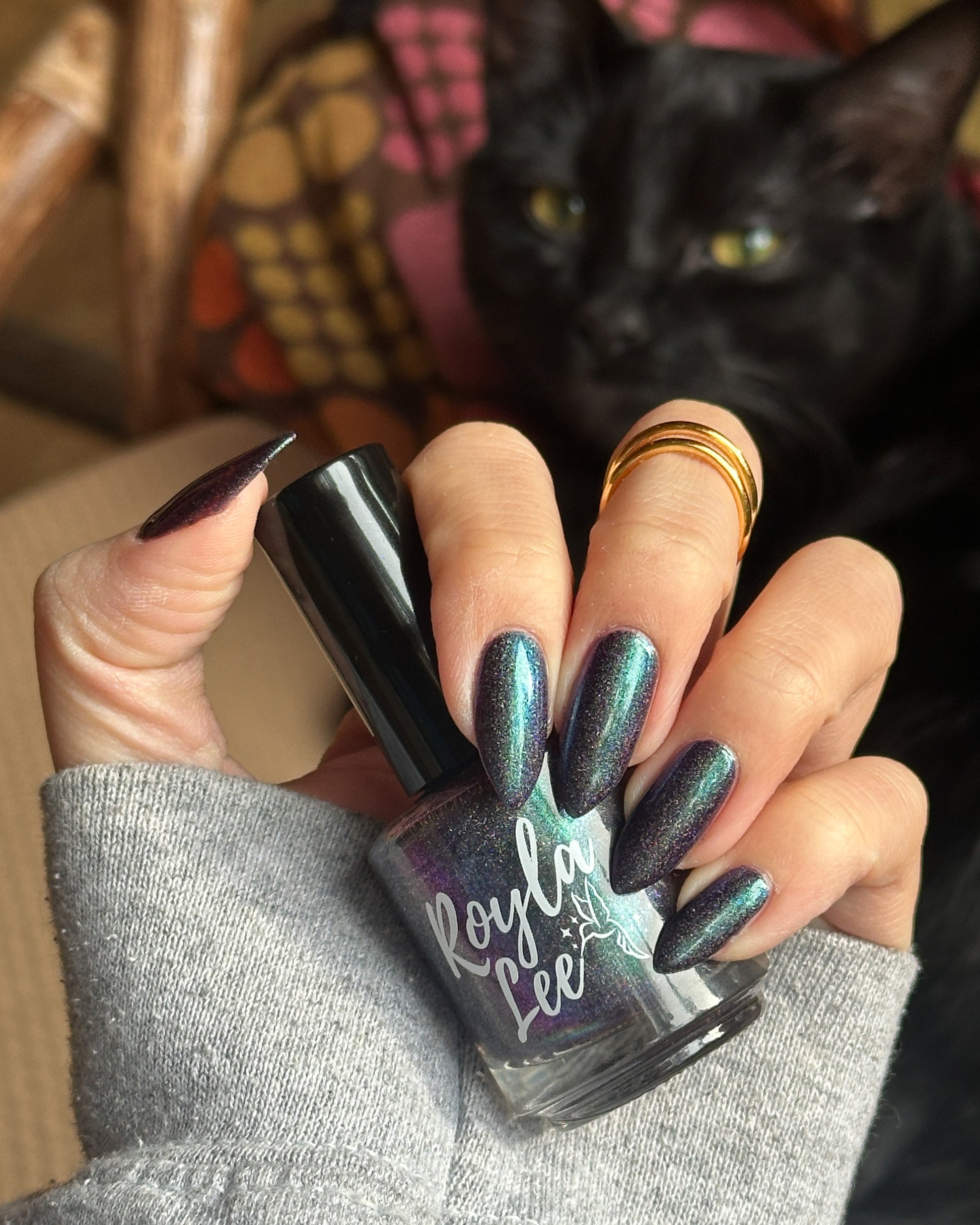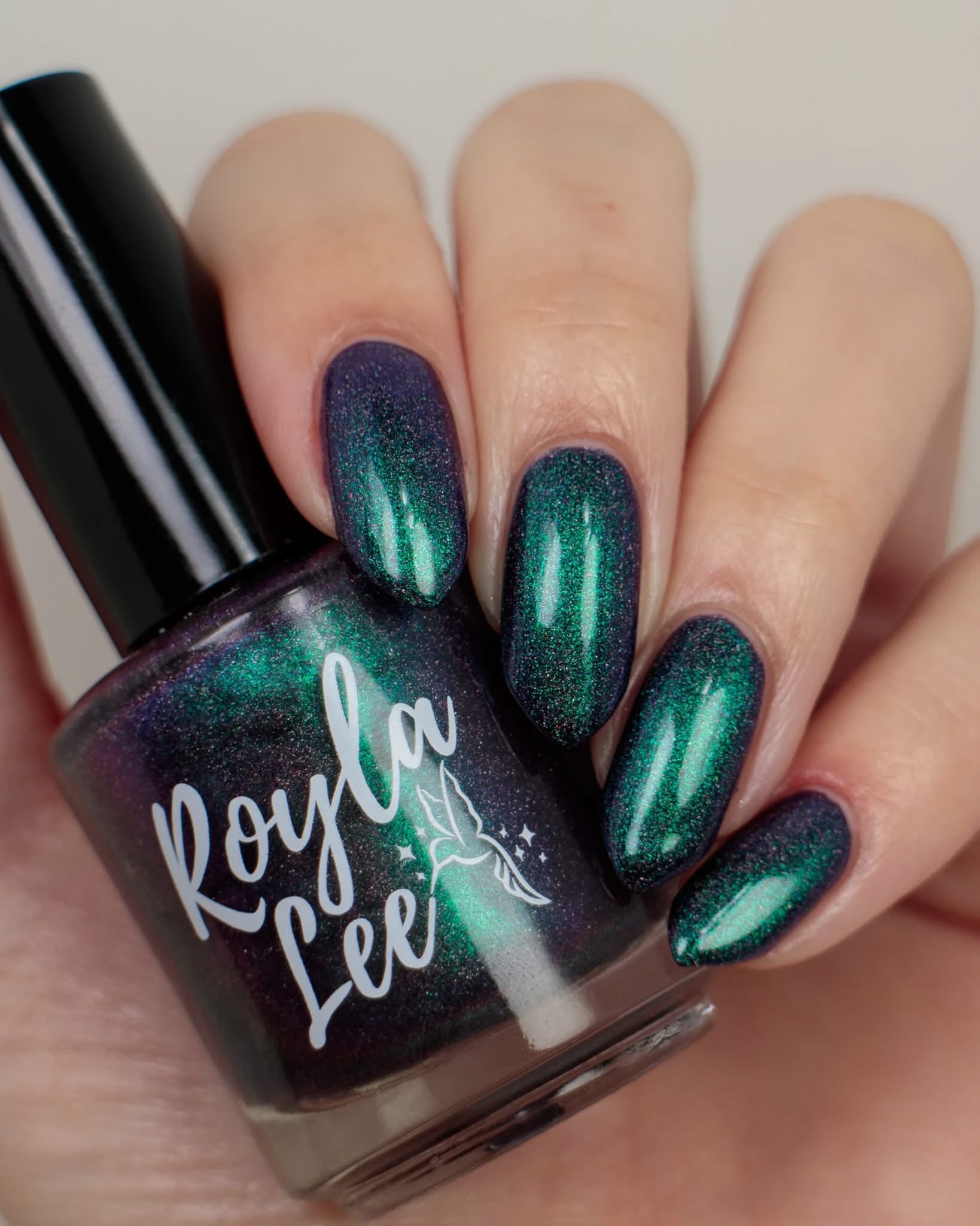 A blackened purple base with teal to blue shifting shimmer and scattered holo.