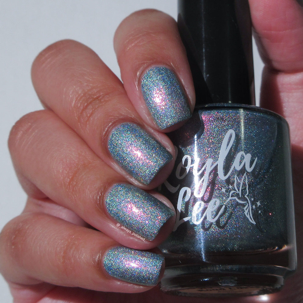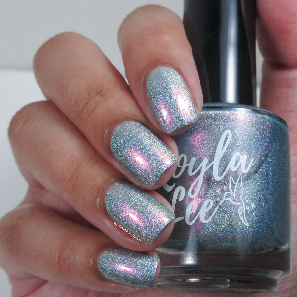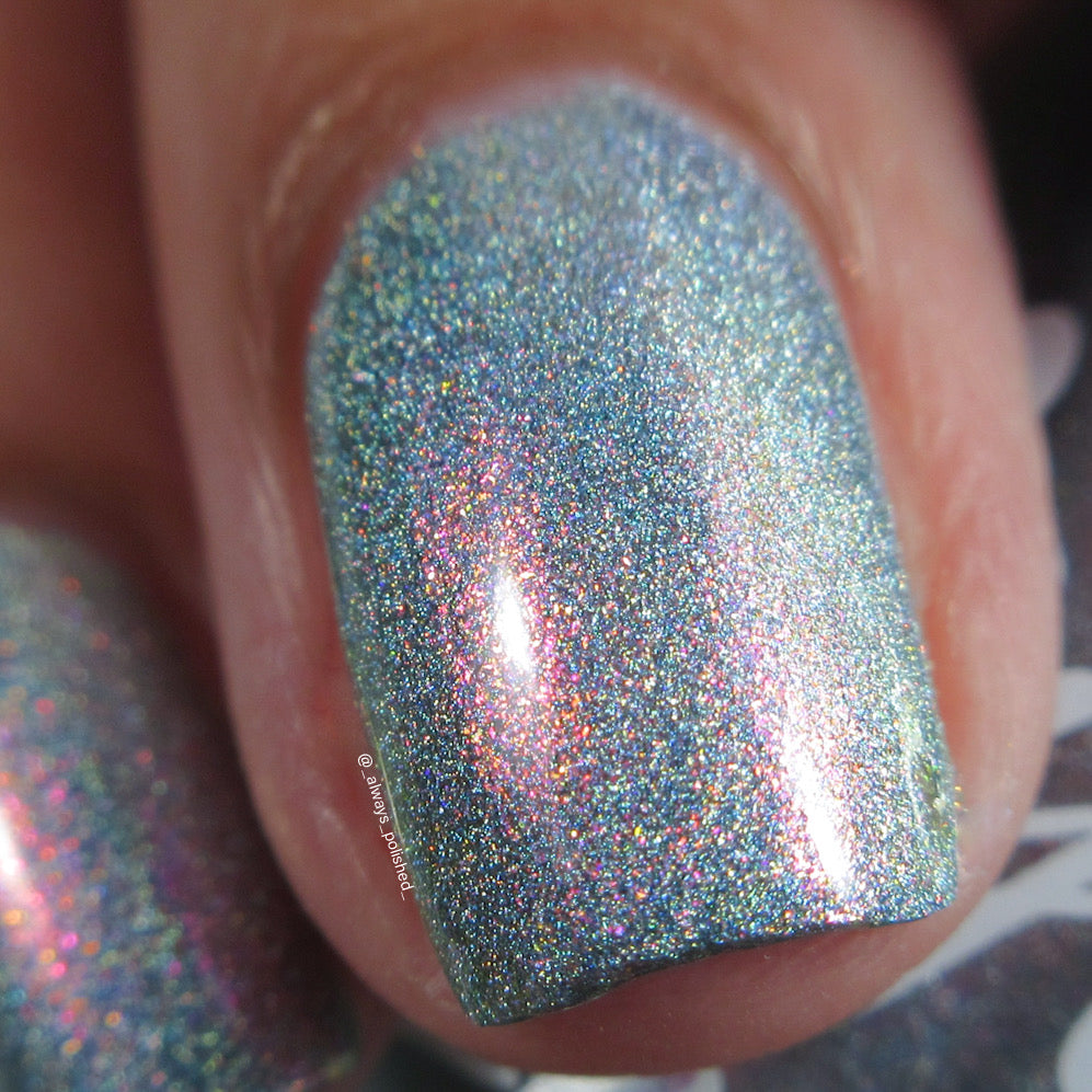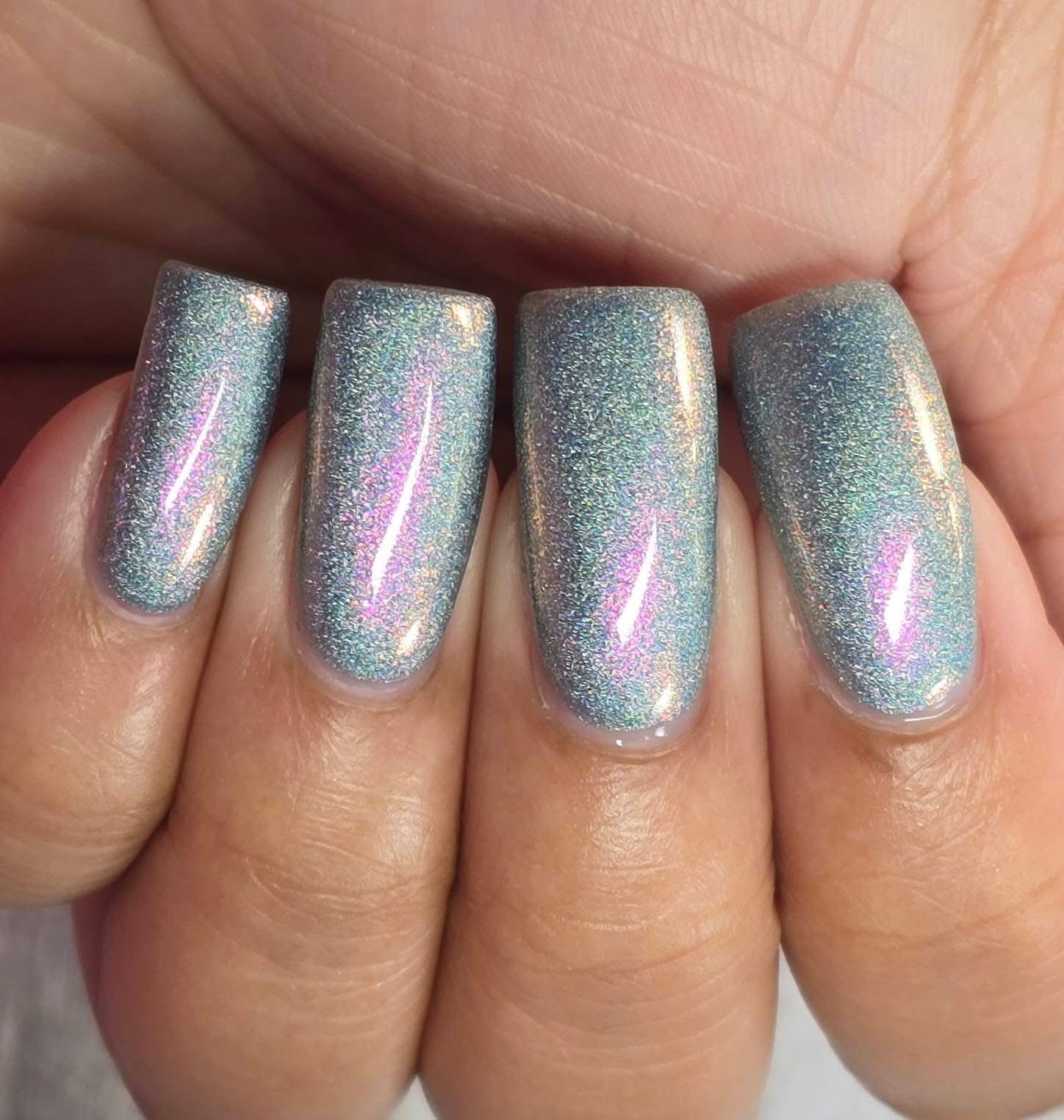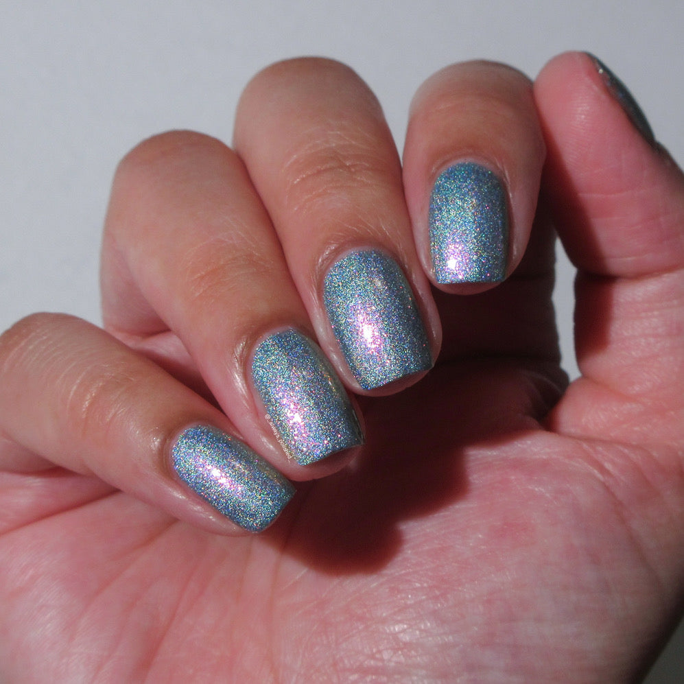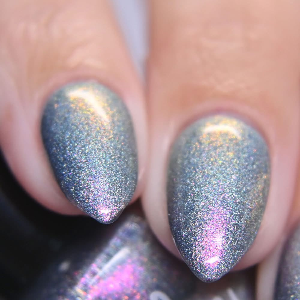 This is a gray/blue holo with pink to orange shifting shimmer.