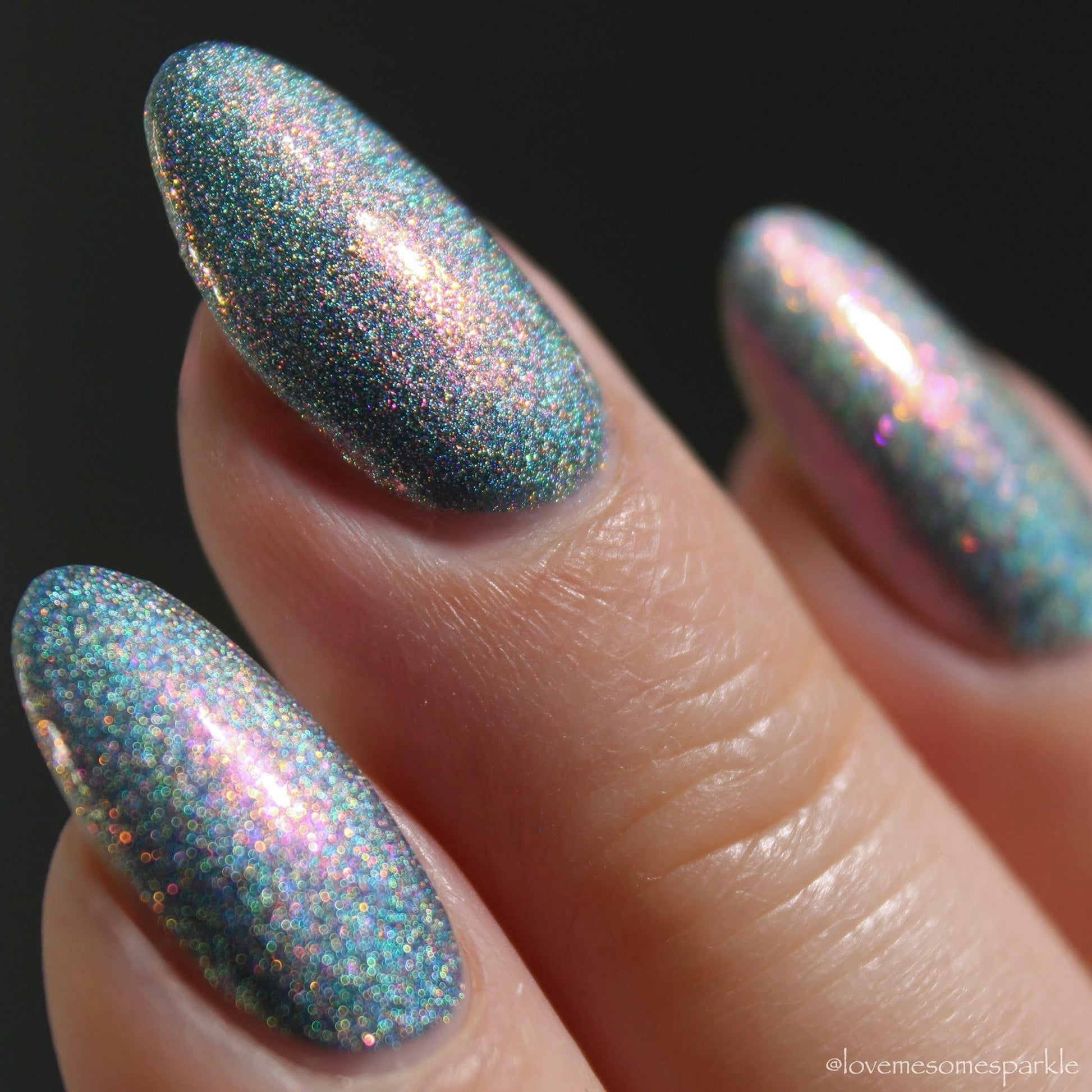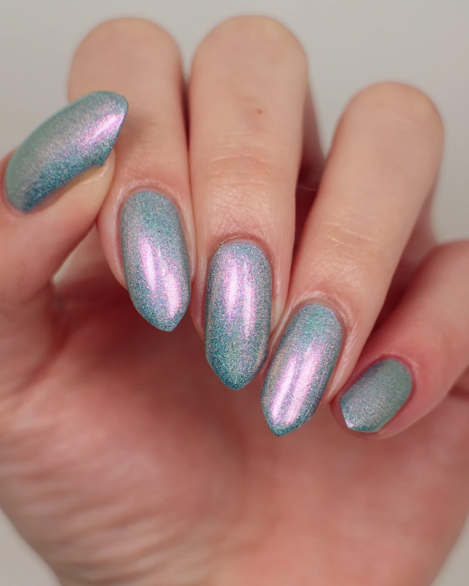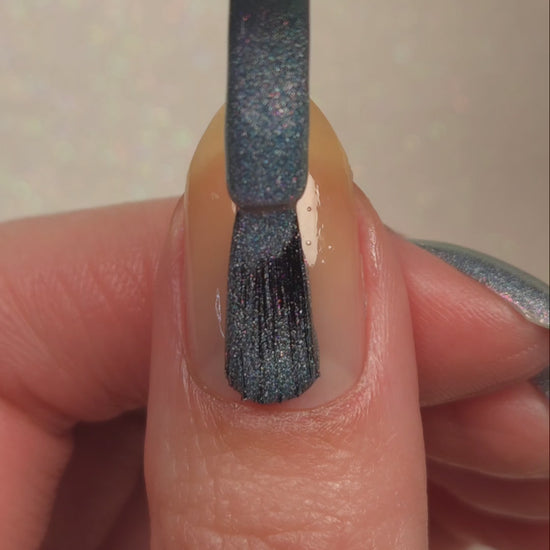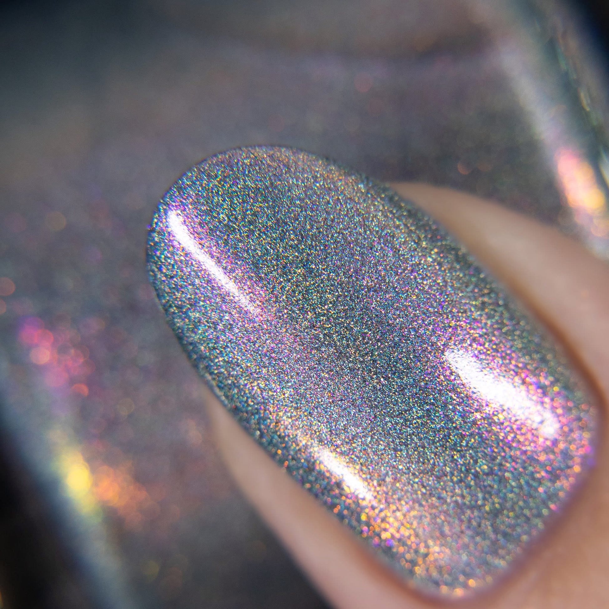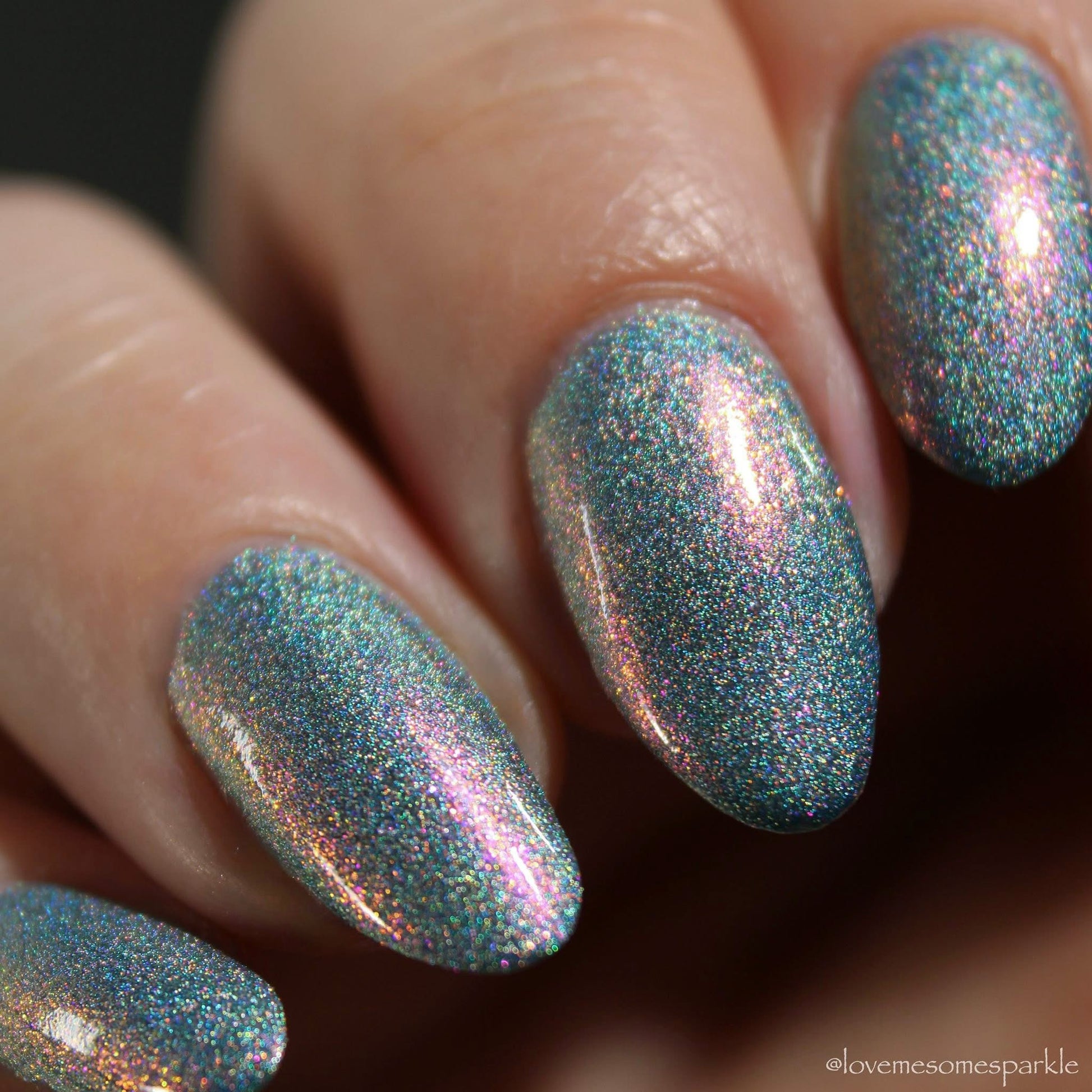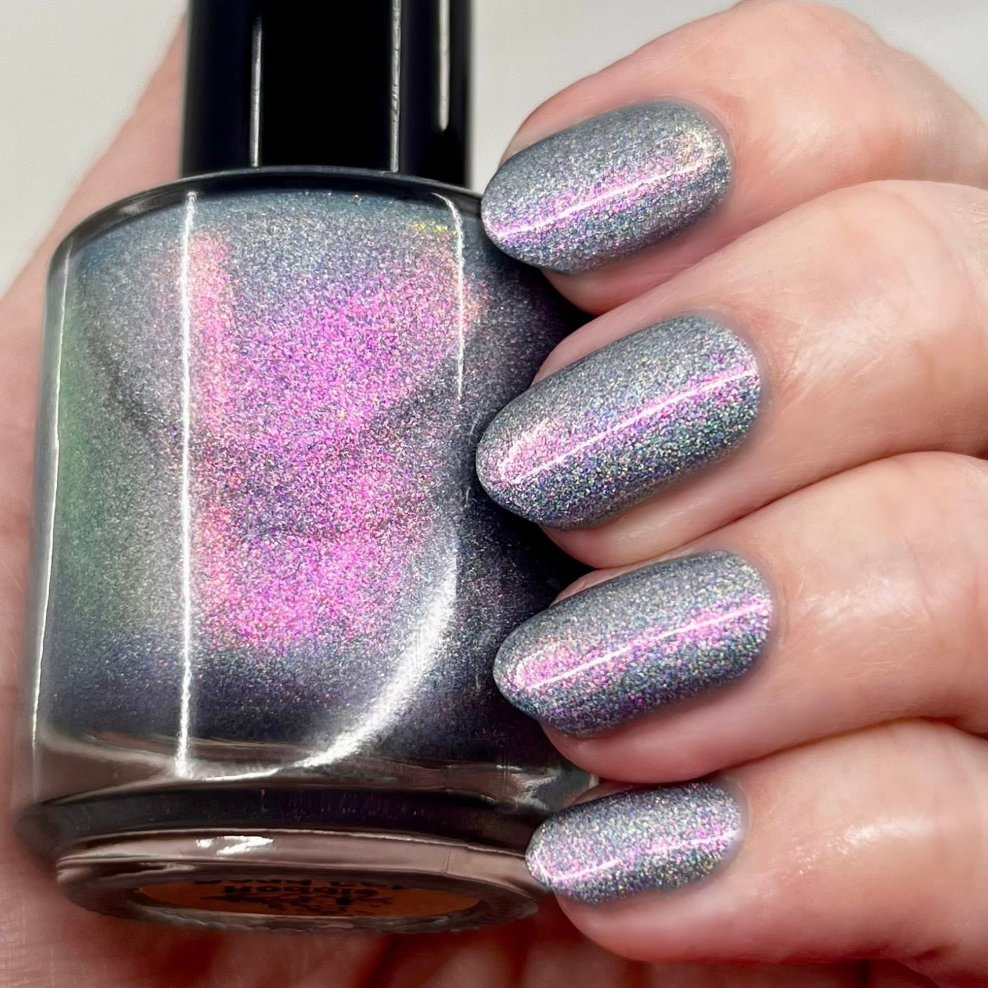 This is a gray/blue holo with pink to orange shifting shimmer.