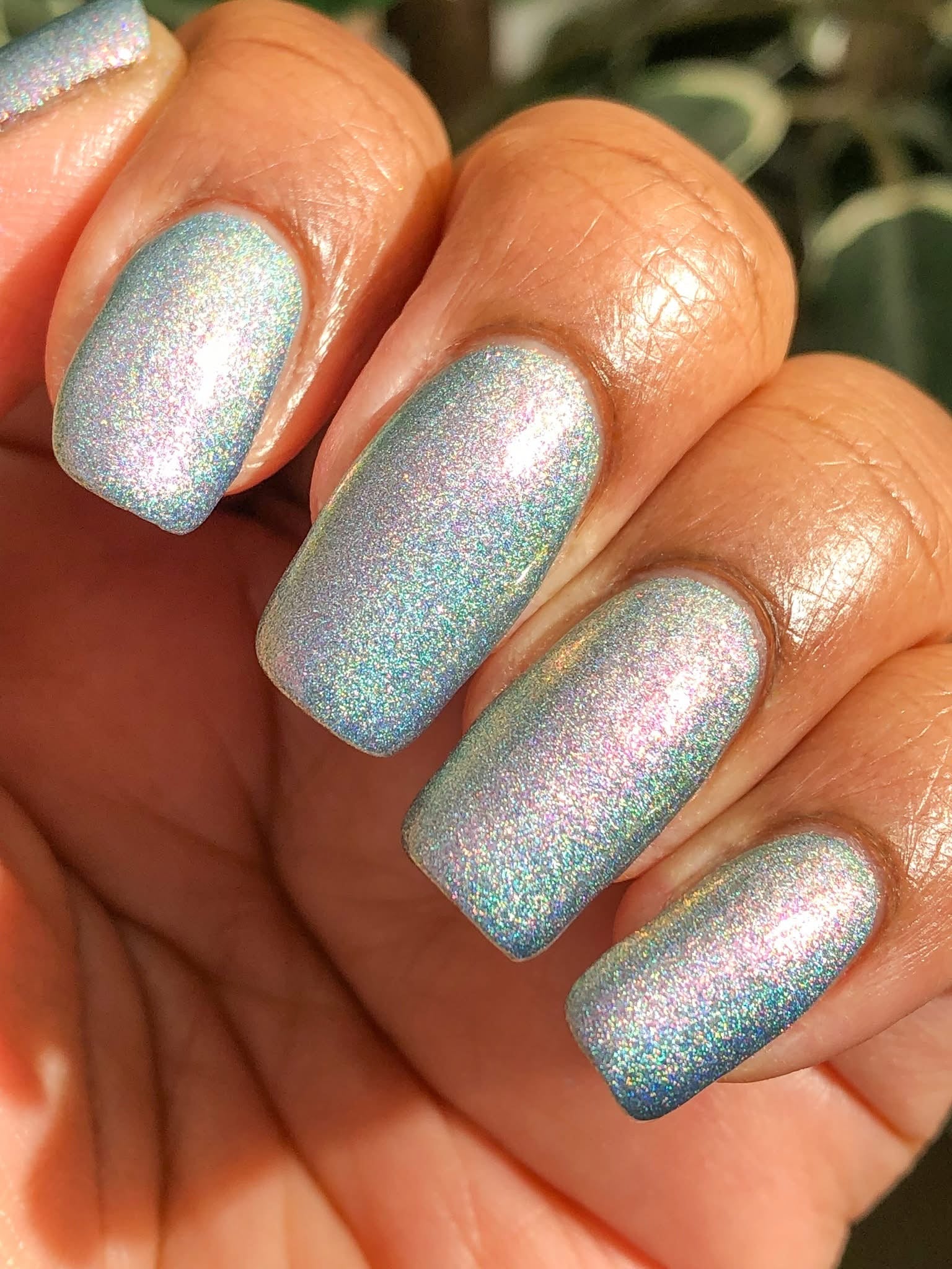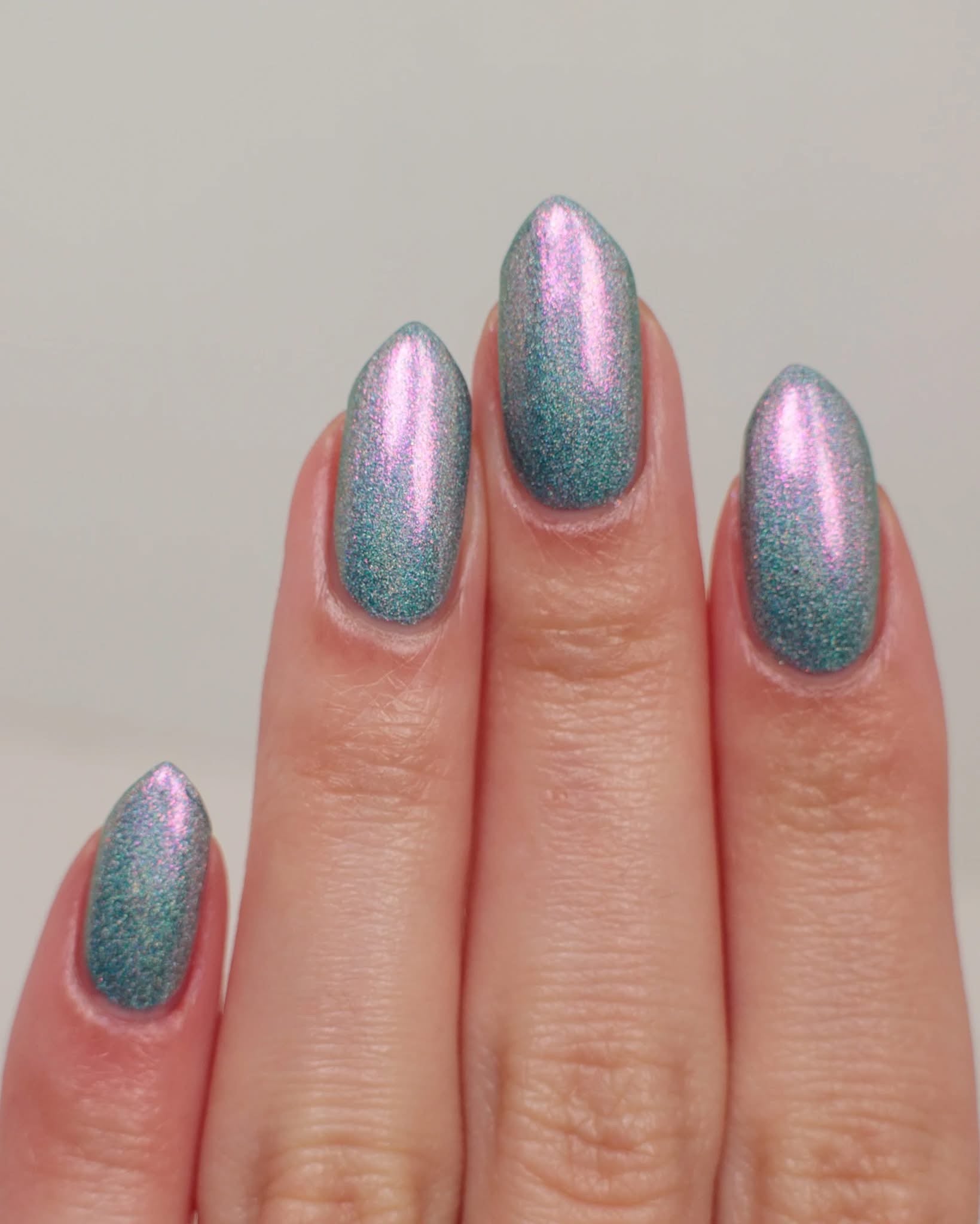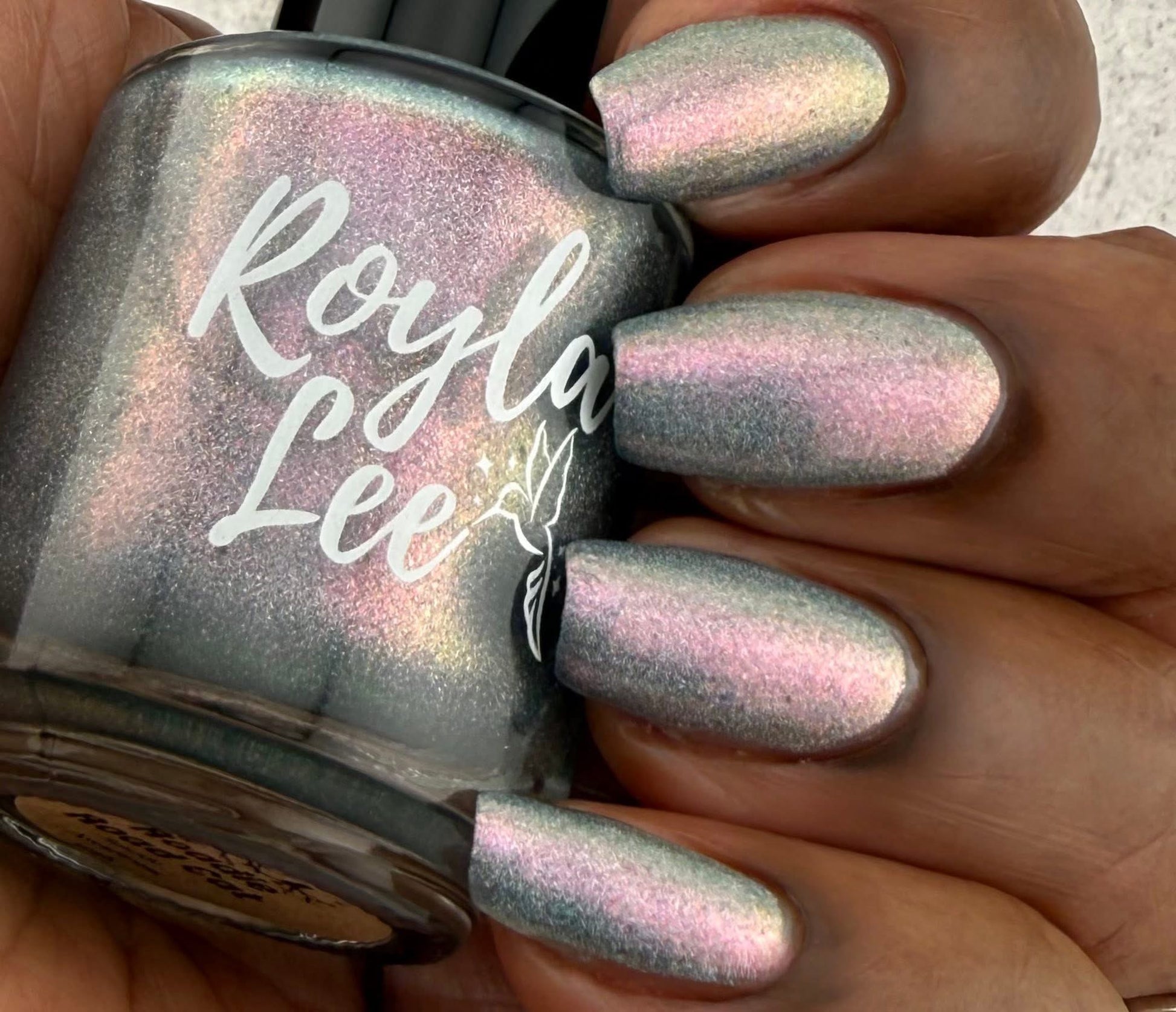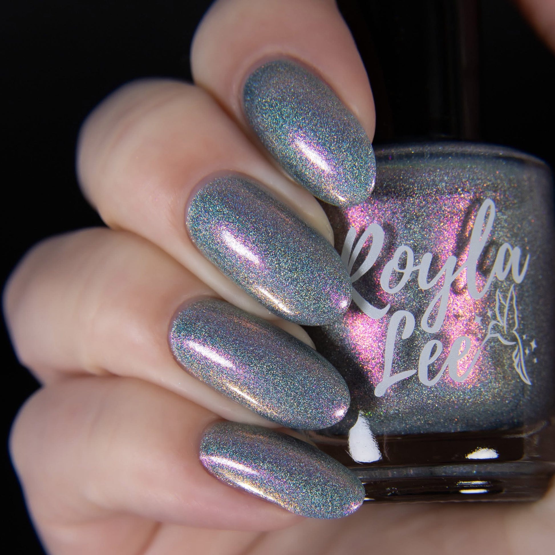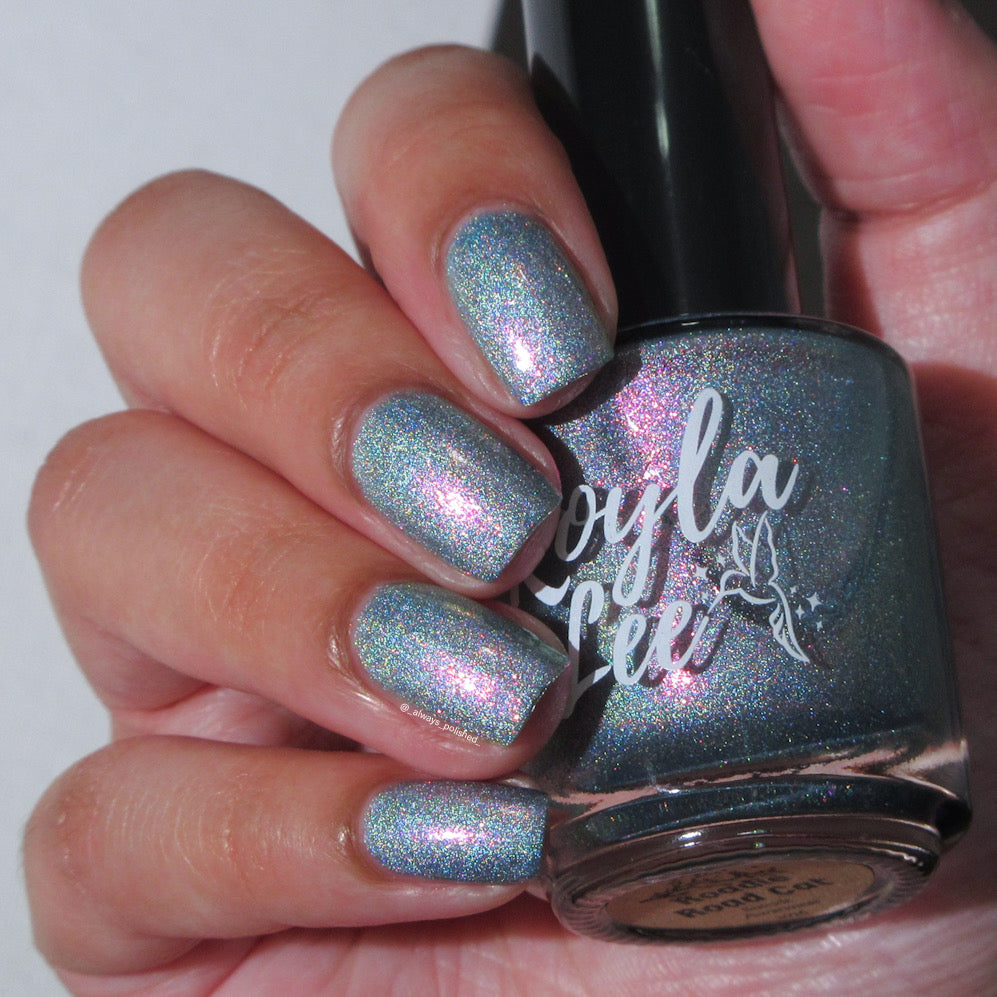 This is a gray/blue holo with pink to orange shifting shimmer.