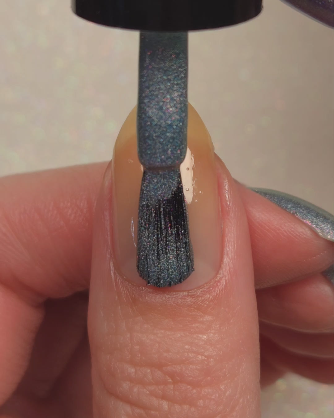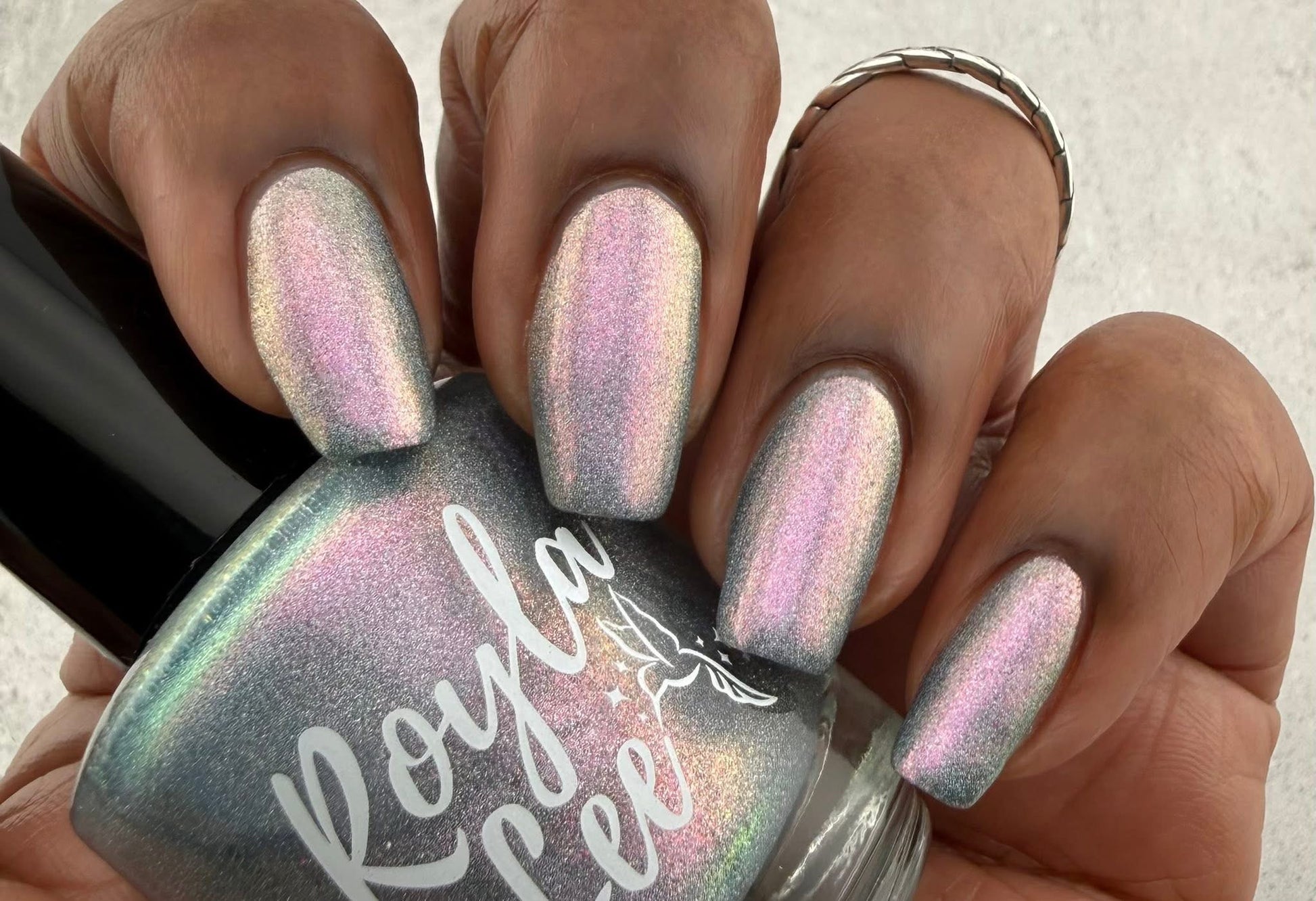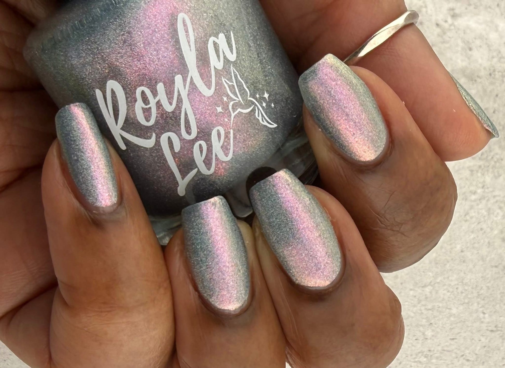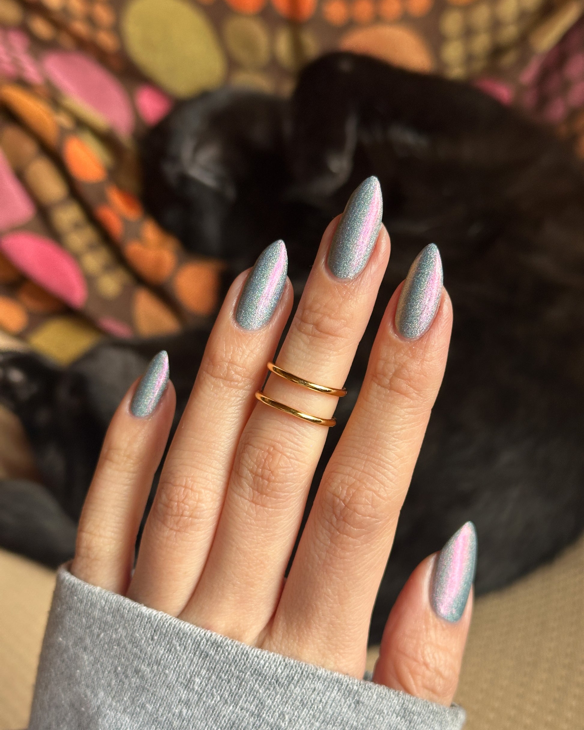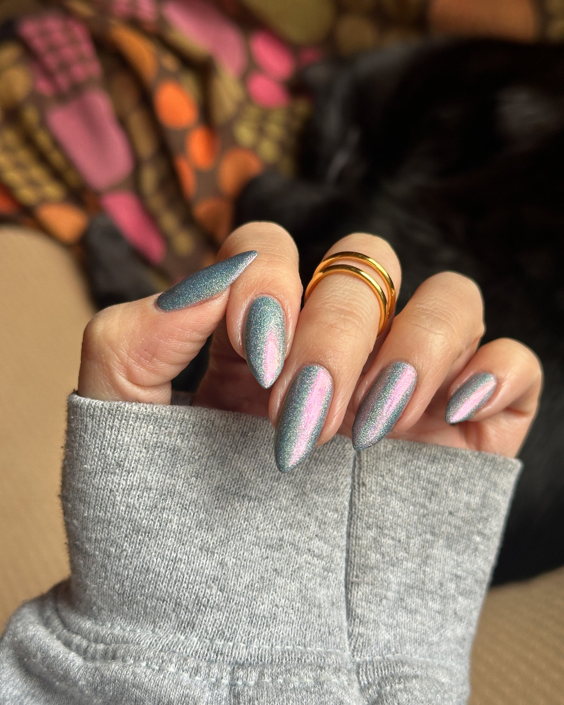 This is a gray/blue holo with pink to orange shifting shimmer.