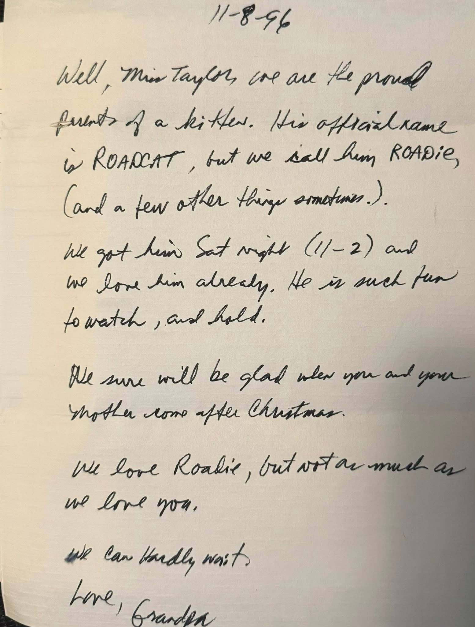 “Road Cat,” affectionately known as Roadie, was found in the middle of the street in the fall of 1996. My grandfather wrote me a letter about finding him (which I've included in the listing if you're curious), and I remember how excited I was knowing I’d be visiting the following month for Christmas.